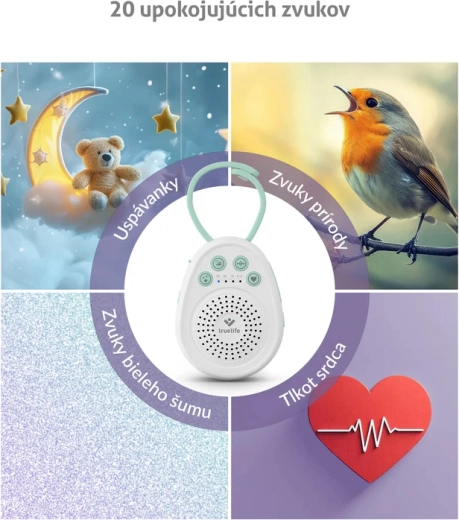 - 20 dźwięków do spokojnego usypiania: 5 melodii, 9 dźwięków natury, 5 białych szumów i 1 bicie serca.