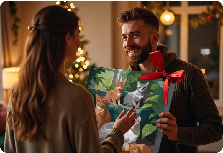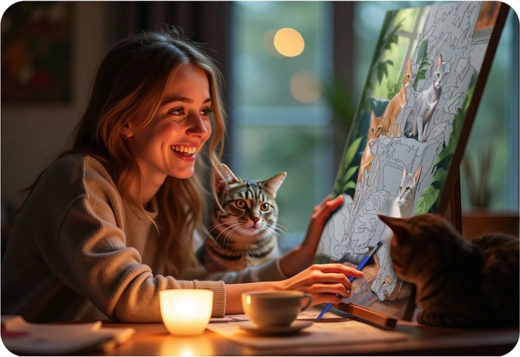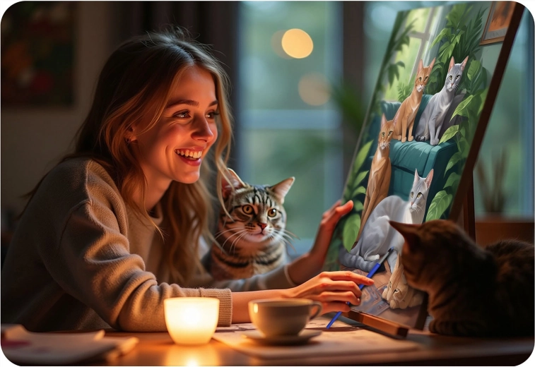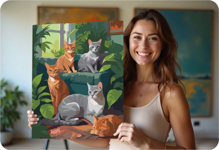 Idealna twórczość dla singli i rodzin. Gotowy obraz z motywem kotów stanie się oryginalną ozdobą wnętrza lub prezentem od serca.