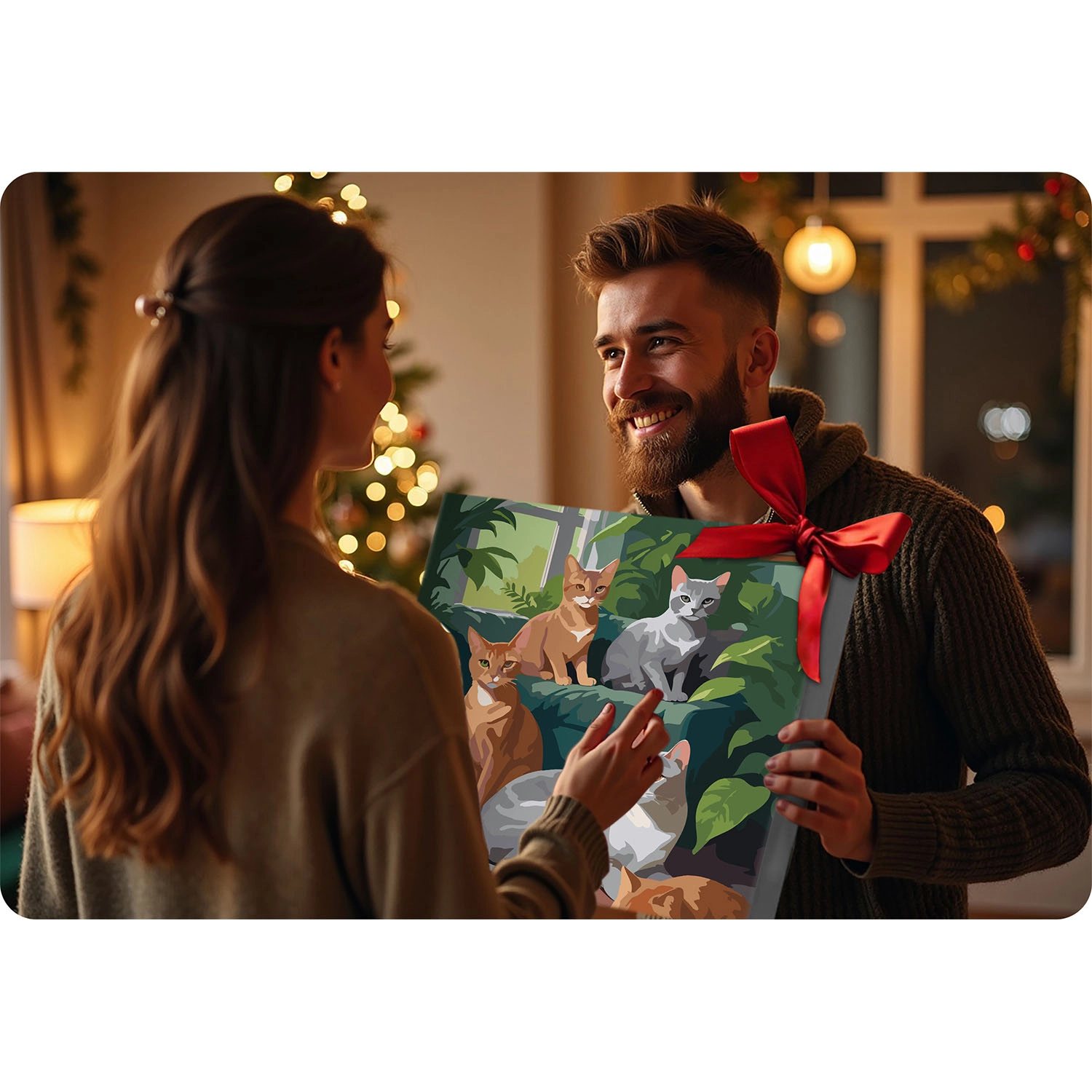 Stwórz własny obraz ścienny z figlarnym motywem kotów wśród zieleni. Zestaw MASSIDO do malarstwa po numerach jest idealny dla początkujących i zaawansowanych – wystarczy dopasować kolor do numeru i stopniowo wypełniać pola. Dzięki kolorowemu poddrukowi z delikatnym wzorem i wyraźnymi krawędziami zachowasz pewną rękę i osiągniesz piękny efekt bez stresu.