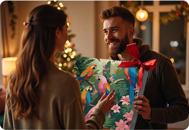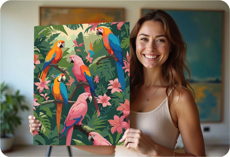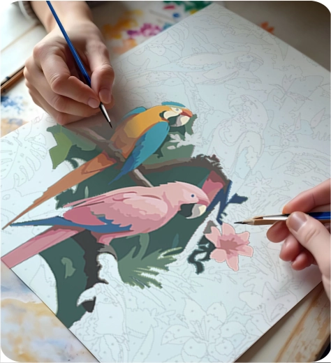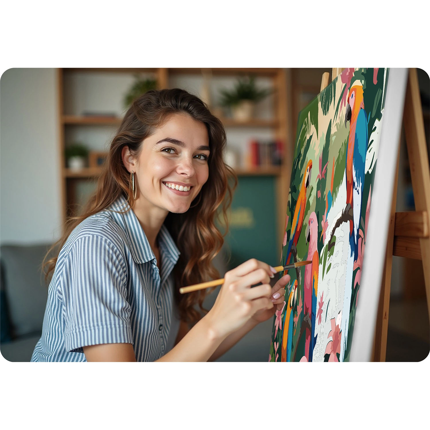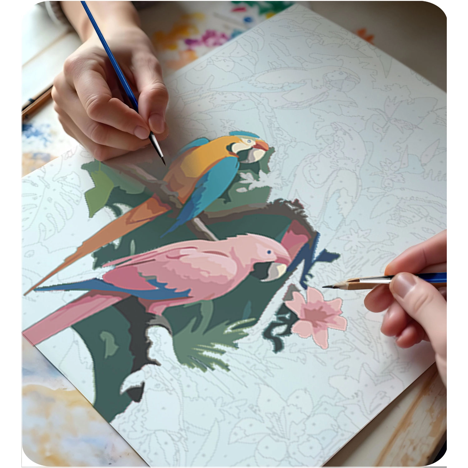 Idealny na wspólne chwile z rodziną – motyw tropikalnych papug zamienia malowanie w zabawne i relaksujące doświadczenie.