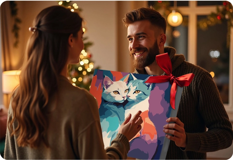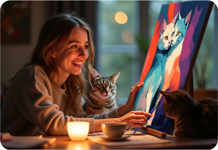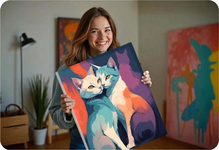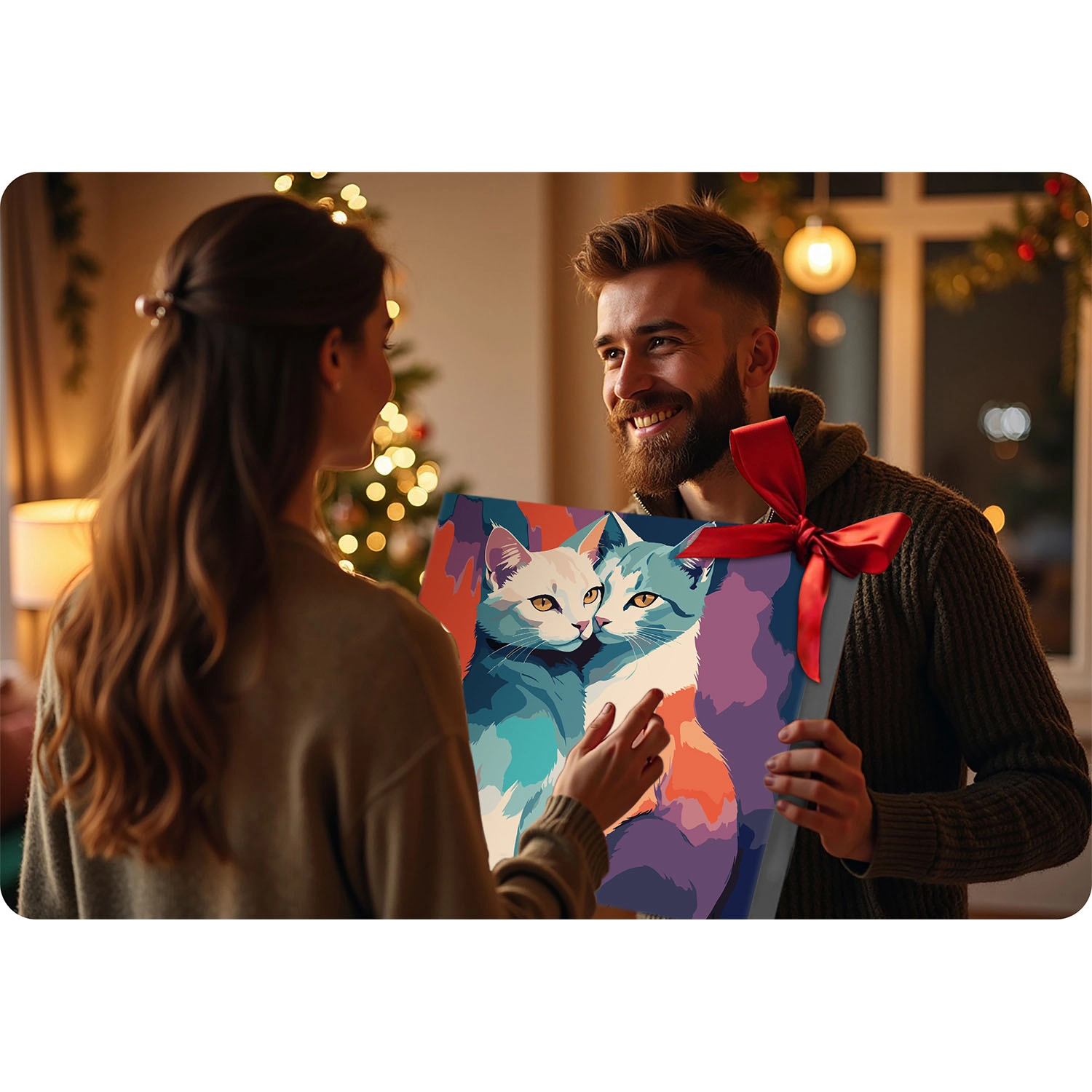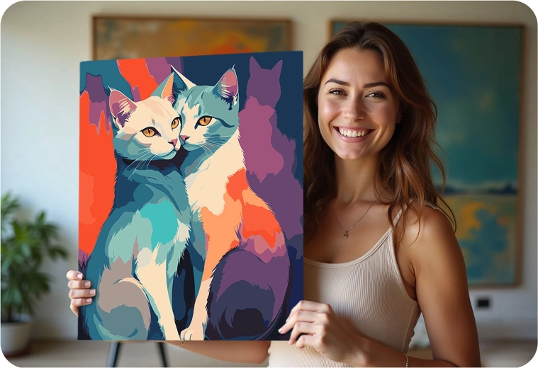 Żywy, nowoczesny motyw kotów rozświetli każde wnętrze. Gotowe dzieło to świetna dekoracja i osobisty prezent od serca.