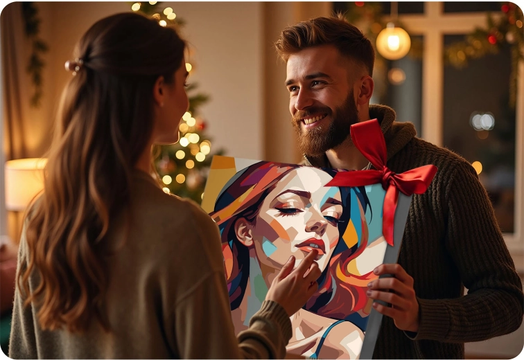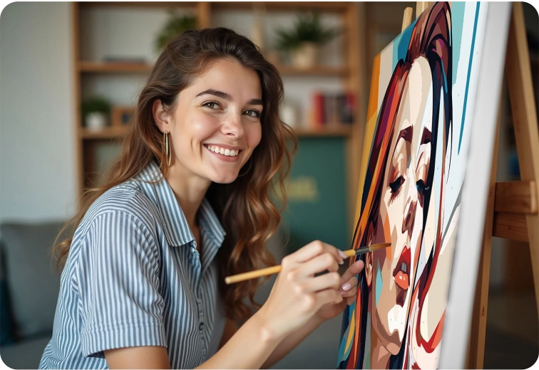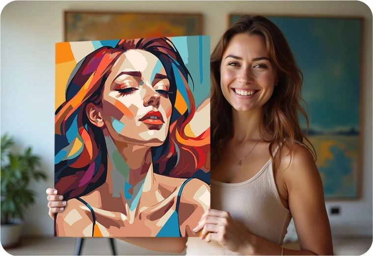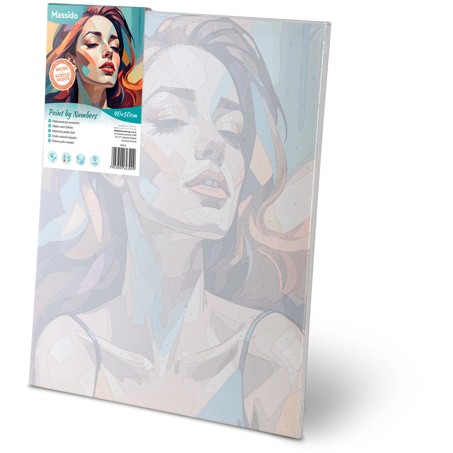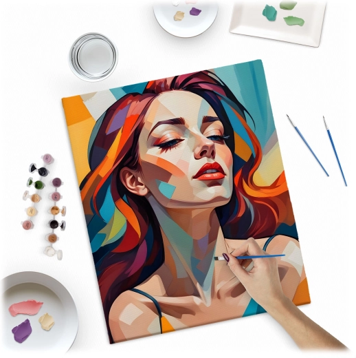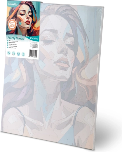 Uwolnij swoją kreatywność z premium zestawem MASSIDO. Wysokiej jakości płótno naciągnięte na drewnianą ramę, z wydrukowanymi i ponumerowanymi polami, poprowadzi Cię krok po kroku. Wystarczy dopasowywać numery do farb i obserwować, jak powstaje żywy, nowoczesny portret kobiety z wyrazistymi kolorami i czystymi liniami.
