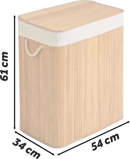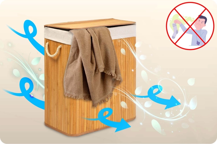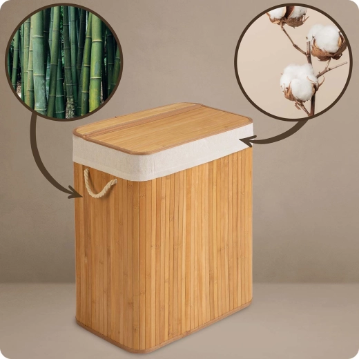 Naturalne materiały – bambus i bawełna – wspierają przewiewność i pomagają ograniczyć wilgoć oraz zapachy. Wyjmowany bawełniany worek możesz łatwo wyjąć, ściągnąć sznurkiem i zanieść prosto do pralki. Praktyczna pokrywa, solidne uchwyty linowe i stabilne dno zapewniają długą żywotność oraz łatwą obsługę.
