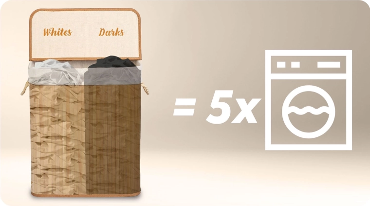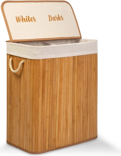 Dwukomorowy kosz na pranie z naturalnego bambusa ułatwi codzienną segregację – wkładając pranie, od razu dzielisz je na Lights i Darks. Dzięki dużej pojemności 100 l pomieści pranie z kilku cykli i utrzyma łazienkę lub sypialnię w porządku i czystości.