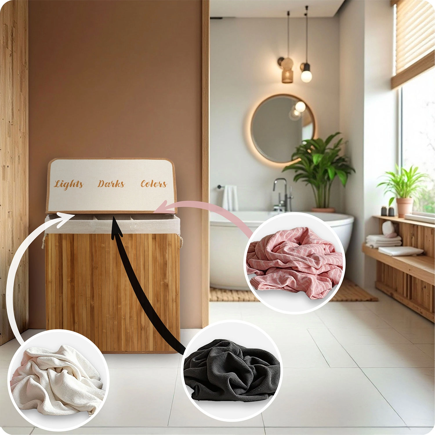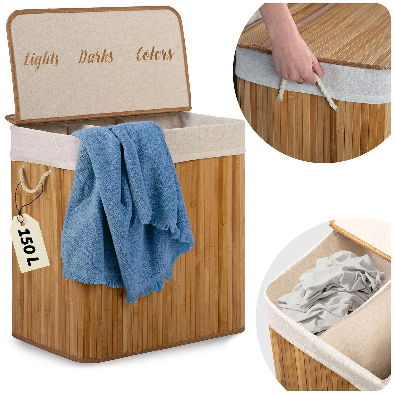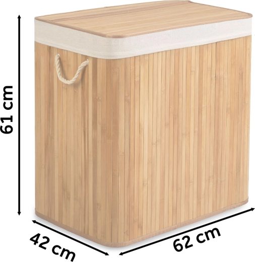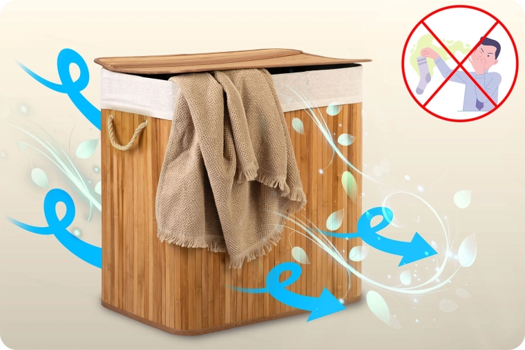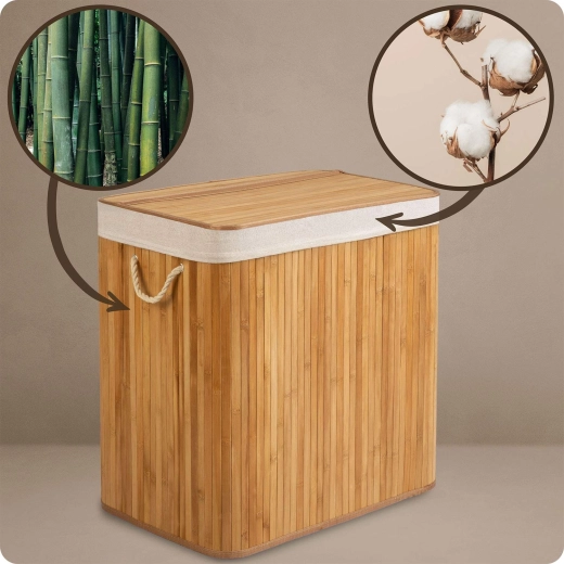 Naturalny bambus i oddychająca bawełna wspierają cyrkulację powietrza i pomagają ograniczyć wilgoć oraz niepożądane zapachy. Przemyślane detale, takie jak mocne sznurowe uchwyty, zdejmowana pokrywa, wyjmowany worek z możliwością zawiązania oraz stabilne pełne dno, czynią z kosza wytrzymałego pomocnika na co dzień.