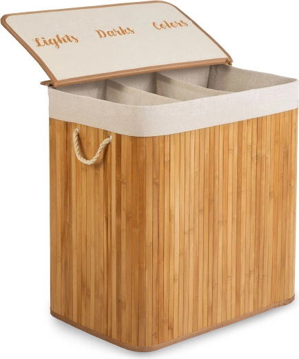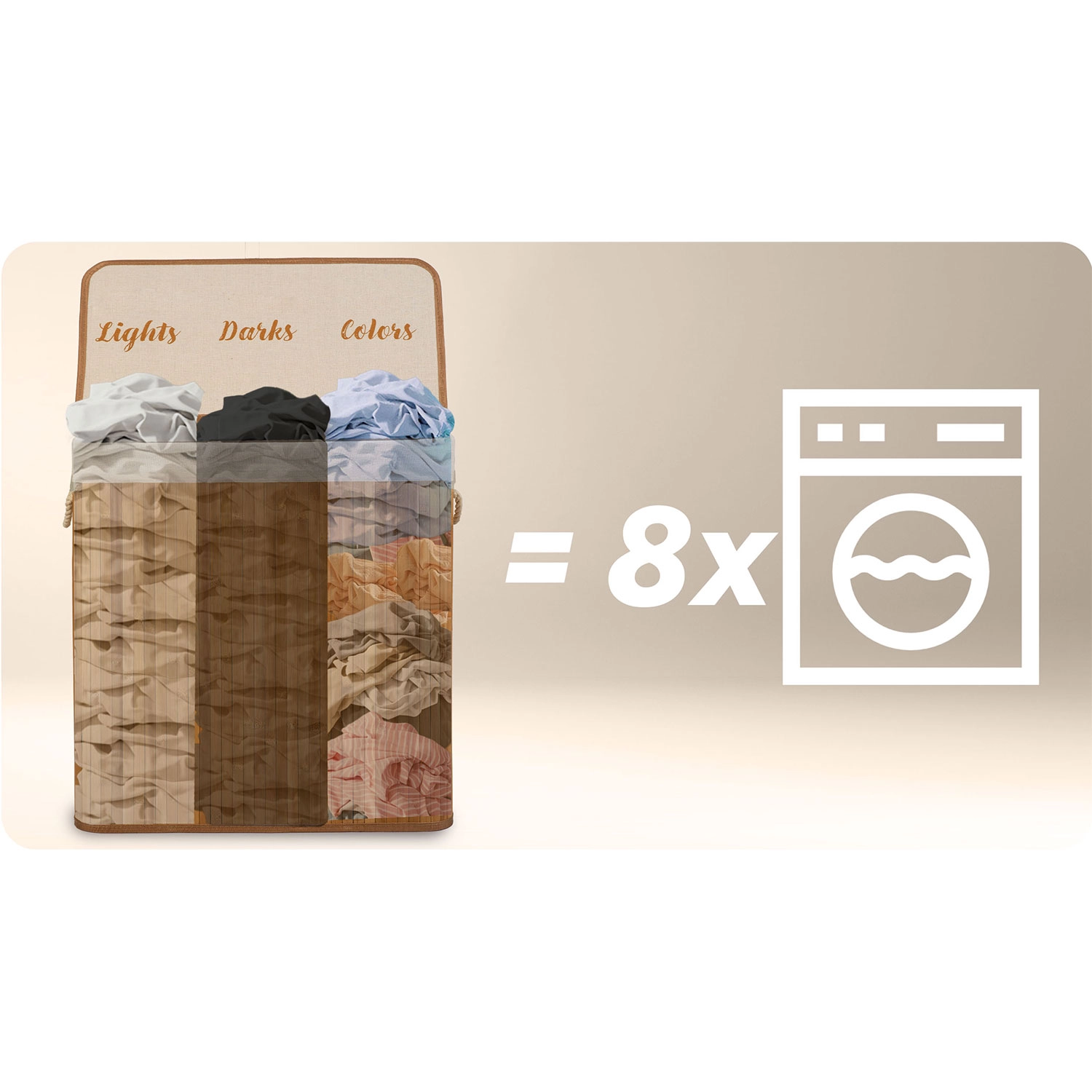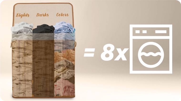 Maksymalna praktyczność i przejrzyste sortowanie prania w jednym. Kosz oferuje pojemność 150 litrów – pomieści zawartość kilku prań – oraz trzy wyraźnie oddzielone sekcje z praktycznym oznaczeniem wewnątrz pokrywy: Lights, Darks, Colors. Dzięki temu oszczędzasz czas i nerwy tuż przed praniem.