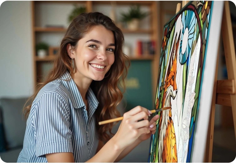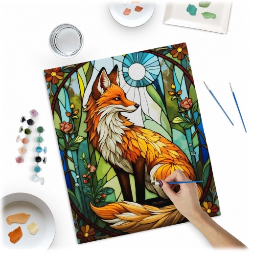 Wstępnie zadrukowane płótno z ponumerowanymi polami i delikatnym podrysowaniem prowadzi Cię krok po kroku do efektownego obrazu lisicy – idealne także dla początkujących.