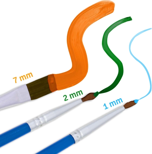 W opakowaniu znajdziesz 30 nasyconych farb akrylowych, trzy pędzle w różnych rozmiarach (1 mm, 2 mm, 7 mm) oraz haczyki do łatwego zawieszenia gotowego obrazu.