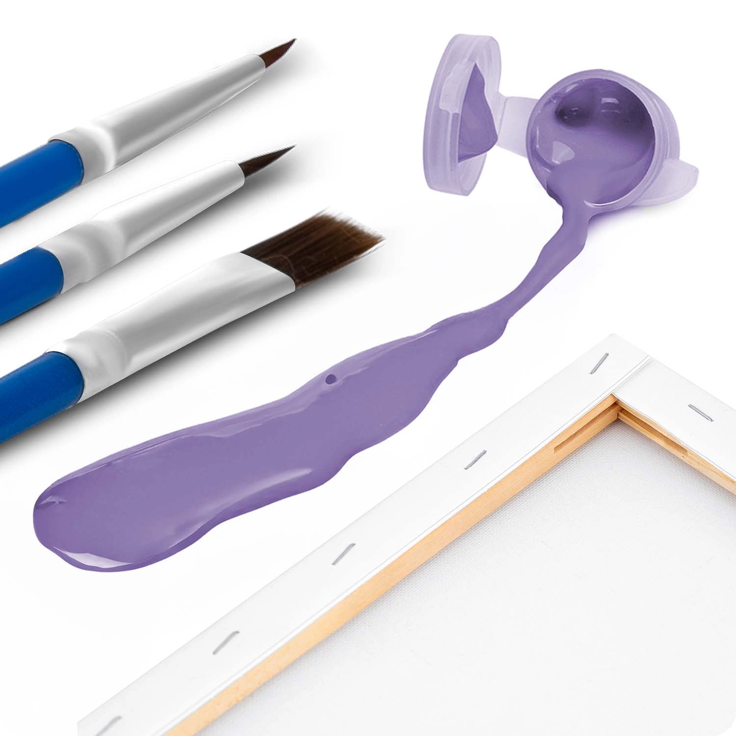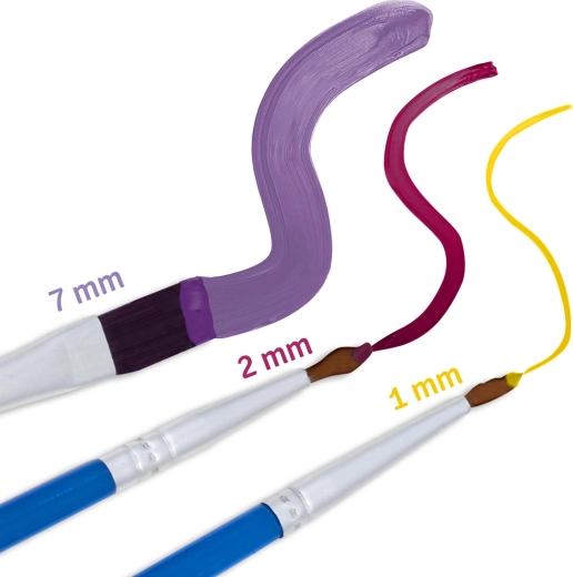 Trzy pędzle (1 mm, 2 mm, 7 mm) pozwalają malować duże powierzchnie i najdrobniejsze detale, a kryjące farby akrylowe gwarantują gładkie nakładanie bez rozcieńczania.