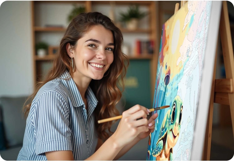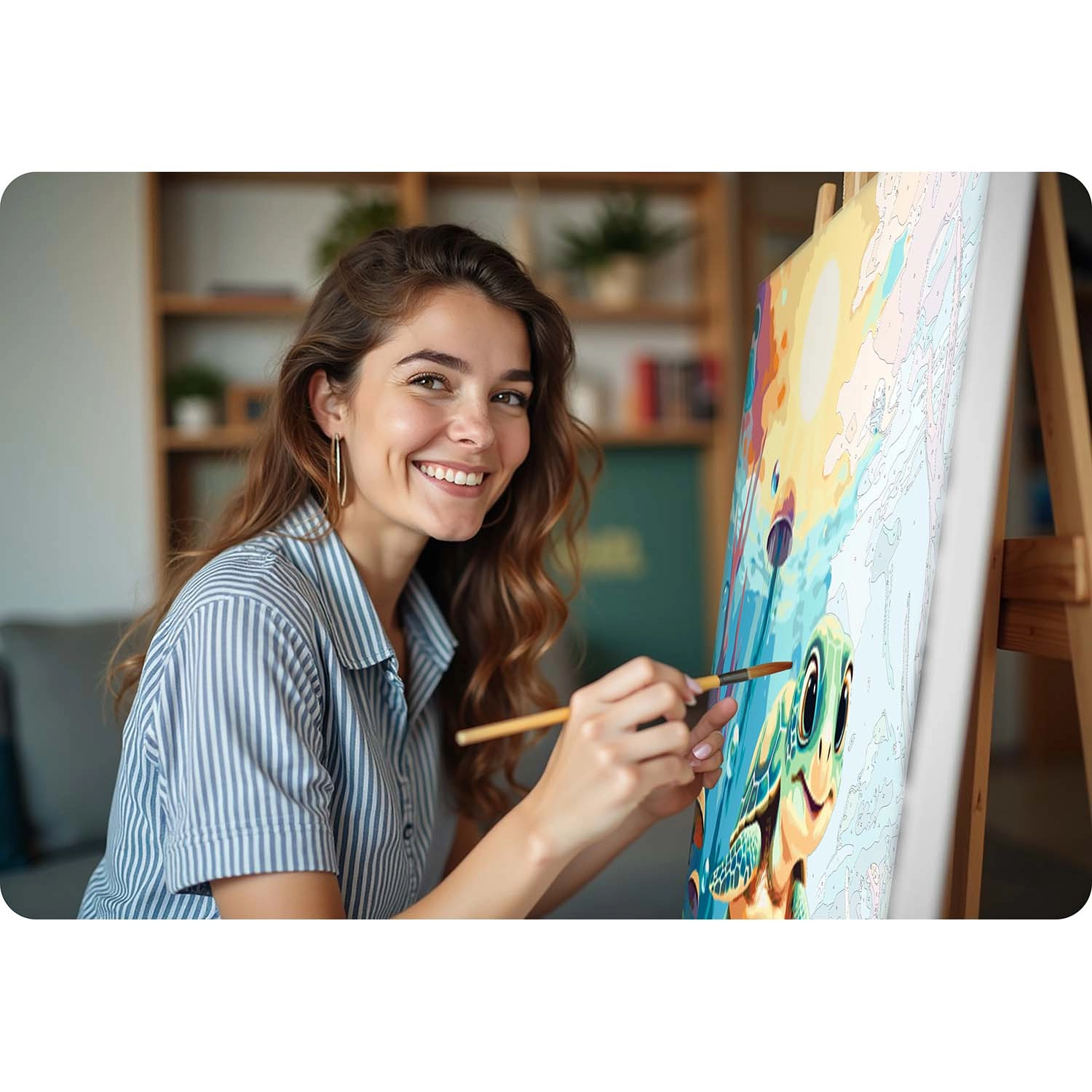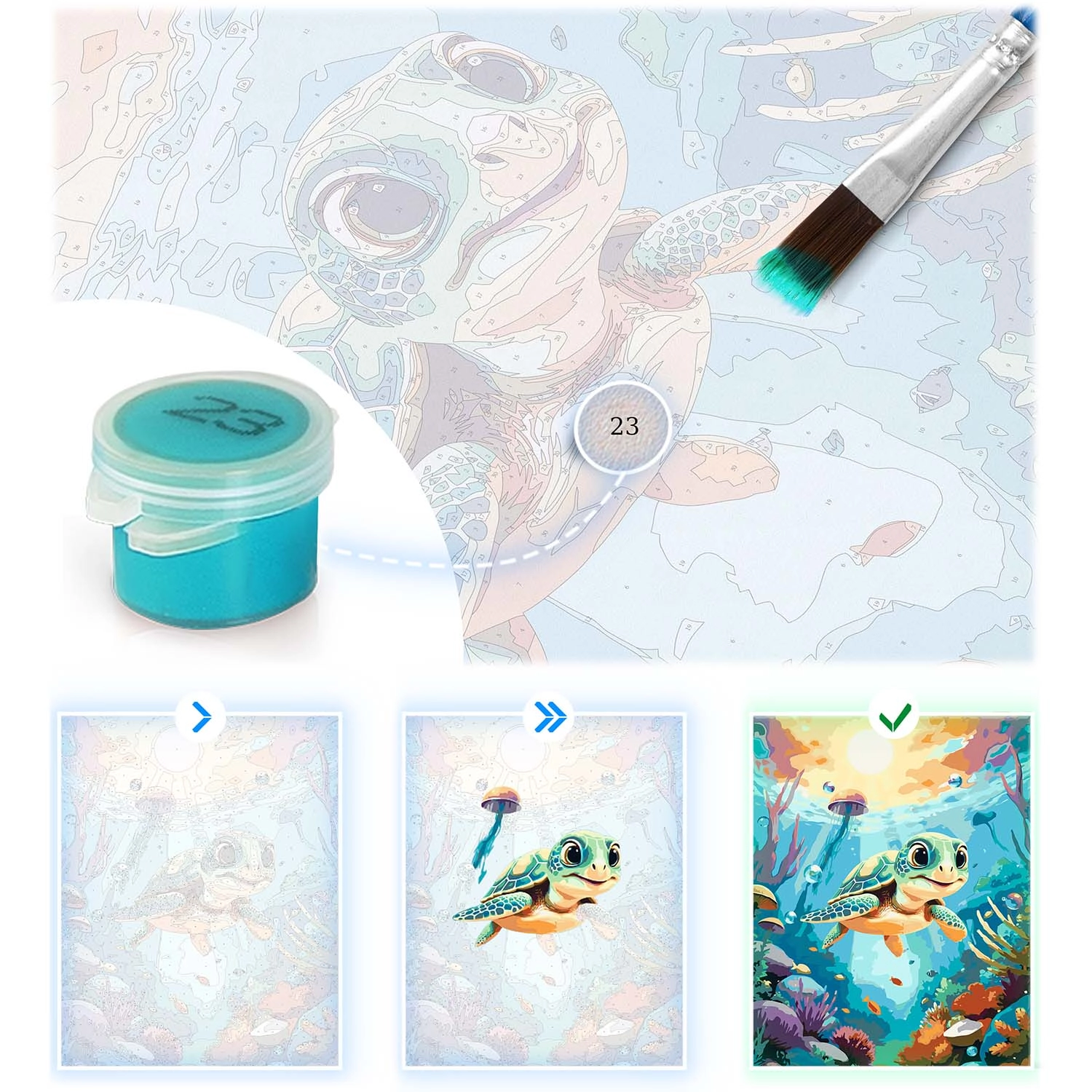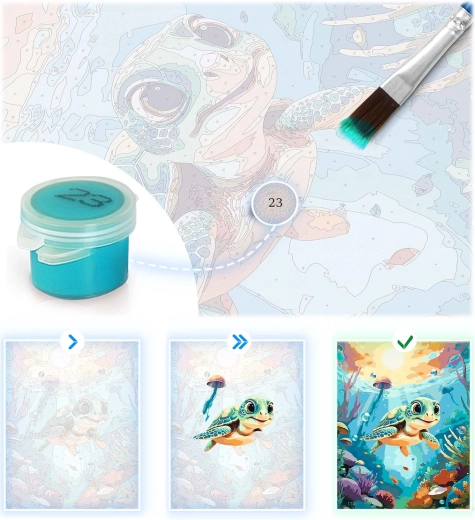 Ten kompletny zestaw do malarstwa po numerach zawiera wszystko, czego potrzebujesz, aby stworzyć piękny obraz z motywem morskiego żółwika. Podstawą jest zagruntowane płótno naciągnięte na solidnej, drewnianej ramie z czytelną numeracją, kolorową podmalówką dla łatwiejszej orientacji oraz intensywnymi, dobrze kryjącymi farbami akrylowymi, których nie trzeba rozcieńczać.