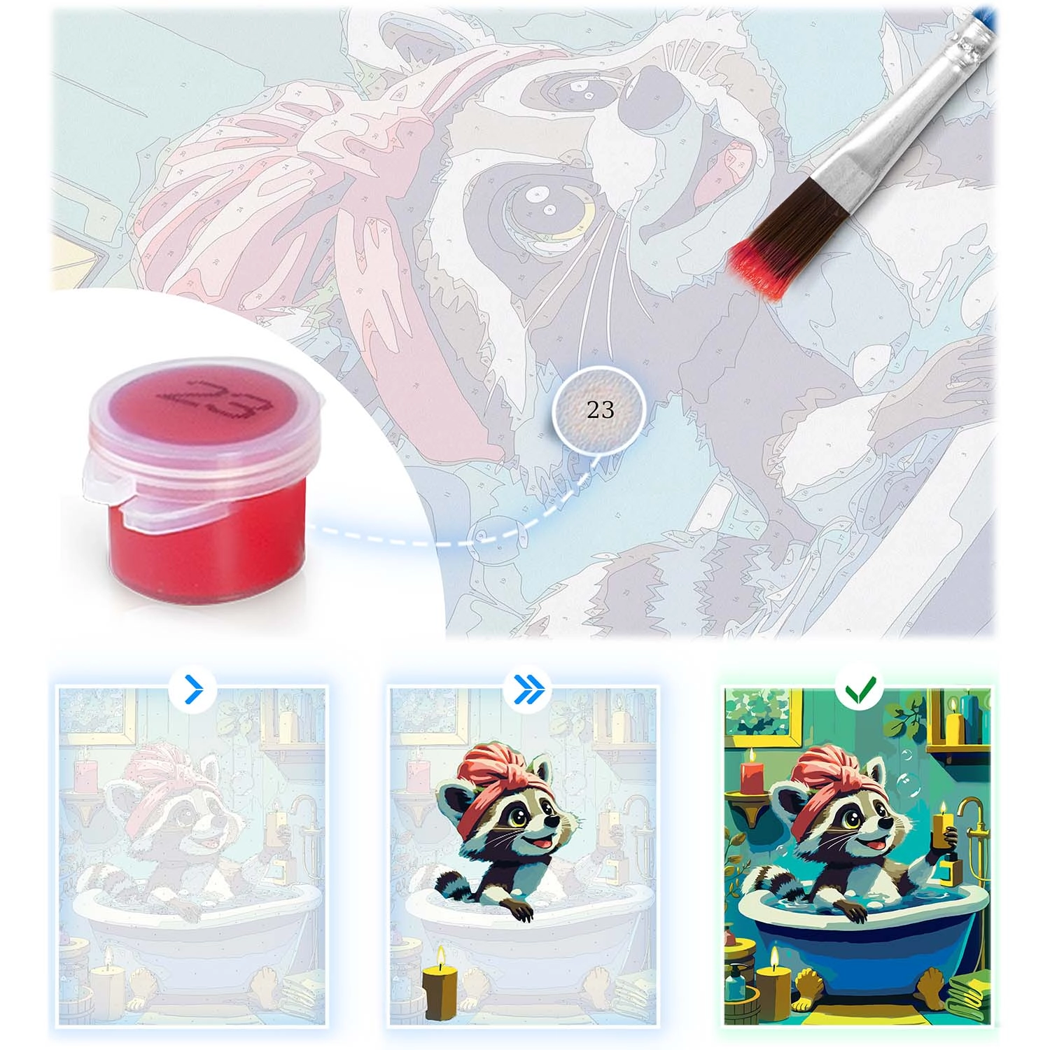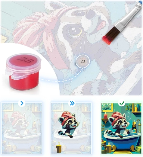 Zestaw malowania po numerach z motywem uroczego szopa zapewnia odprężające, kreatywne doświadczenie i efekt, który z dumą powiesisz na ścianie. Wstępnie nadrukowane płótno z kolorową podmalówką i czytelnymi numerami poprowadzi Cię krok po kroku do pięknego obrazu o intensywnych barwach i pełnym kryciu. Nie musisz być artystą – wystarczy dopasować numer farby do pola i malować.