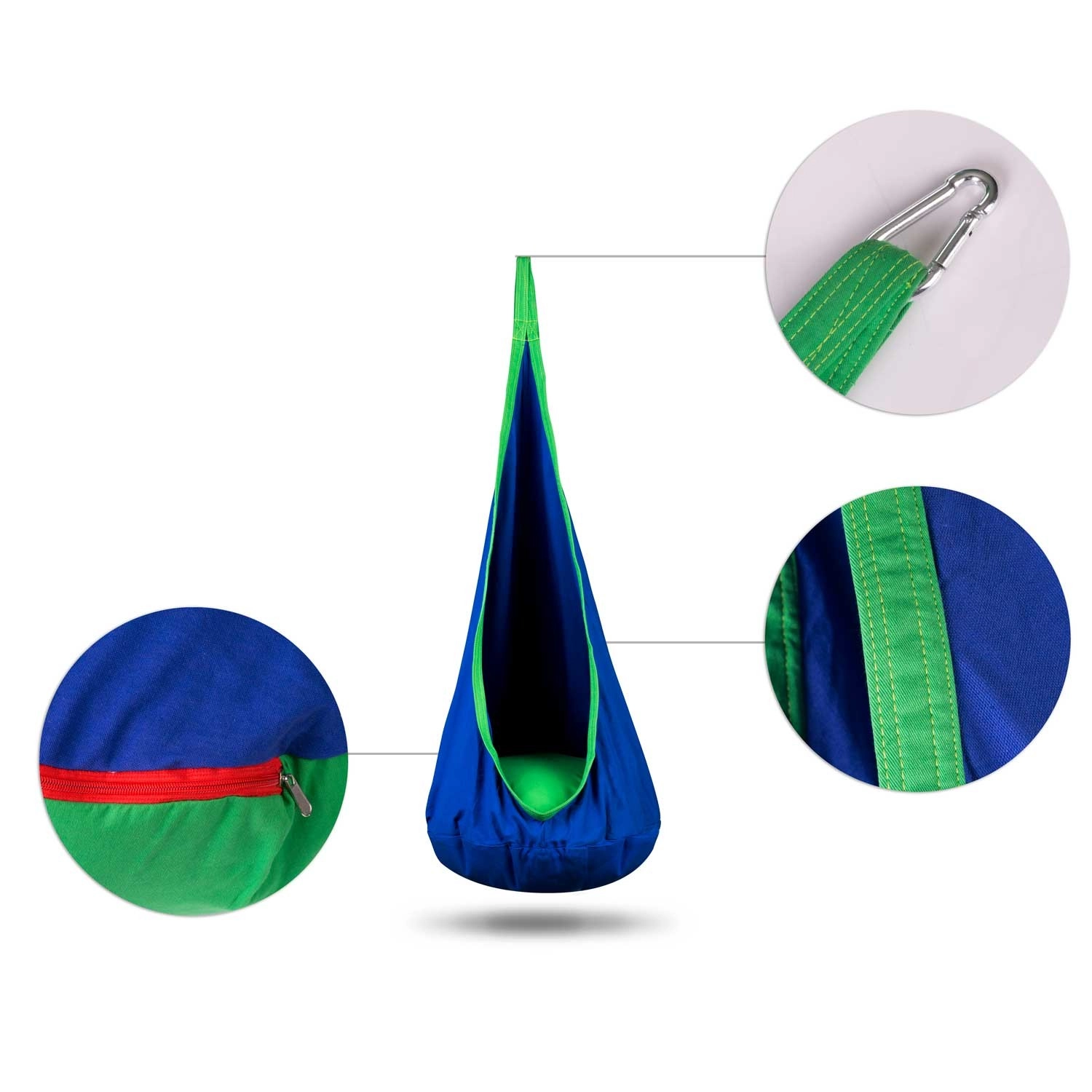 Górne ucho montażowe z hakiem/karabińczykiem umożliwia szybki montaż do sufitu, ramy lub gałęzi. Idealny do pokoju dziecięcego, na taras i do ogrodu.
