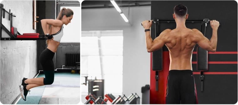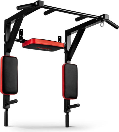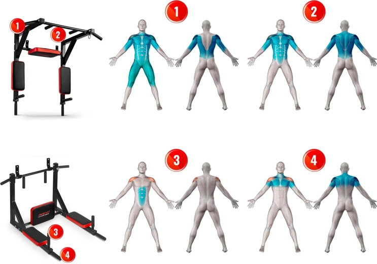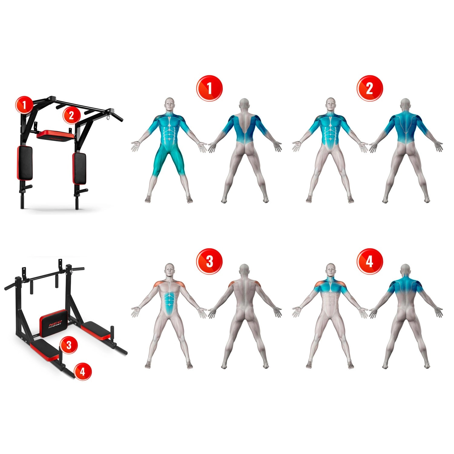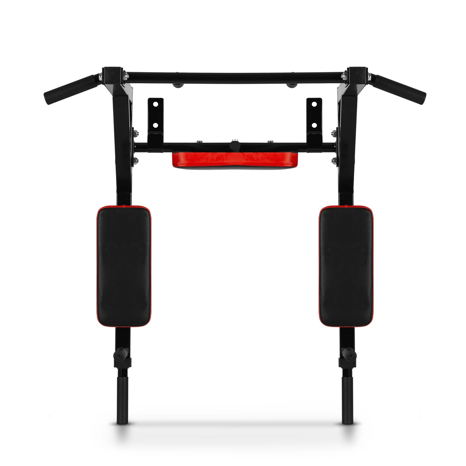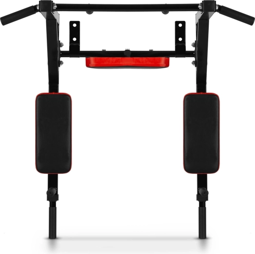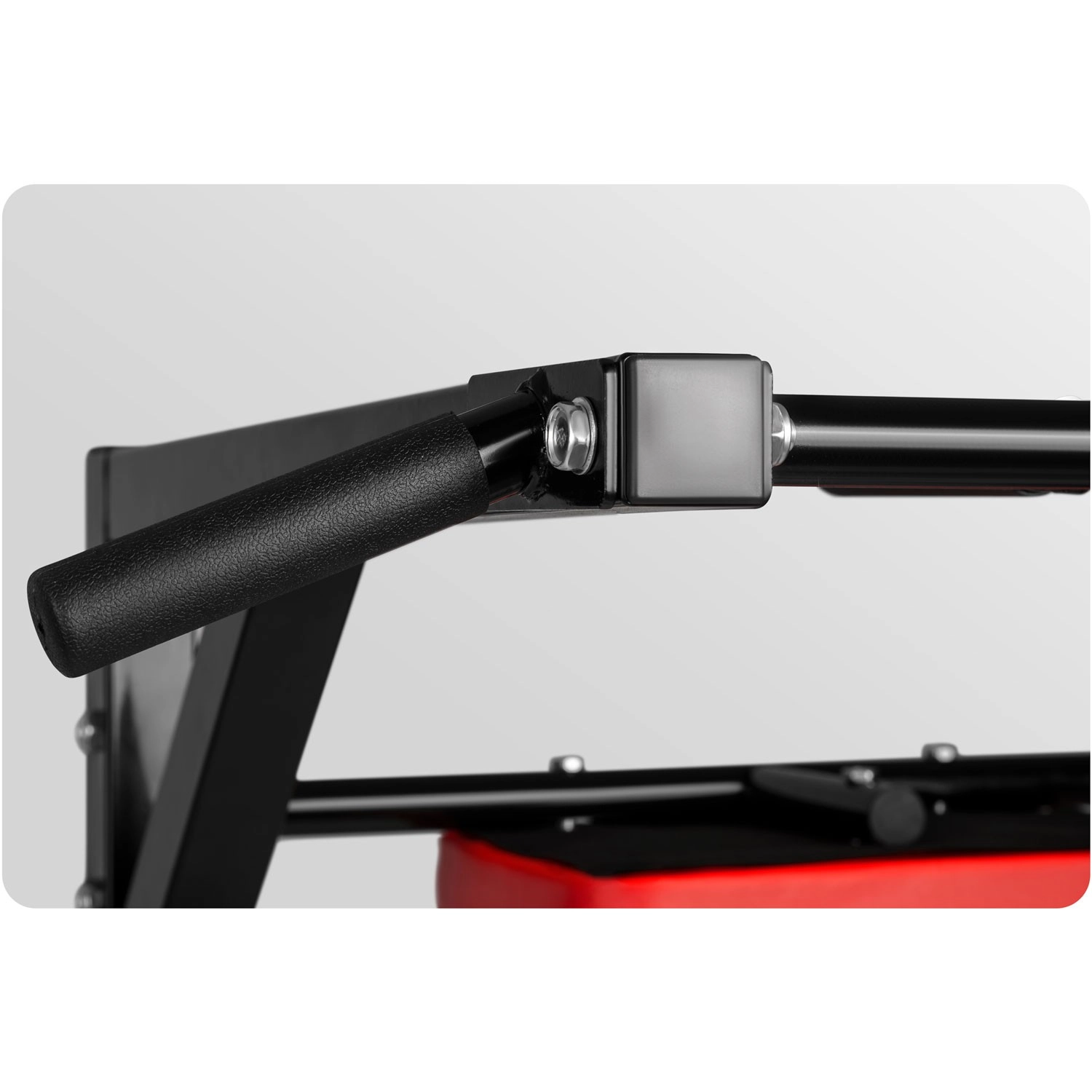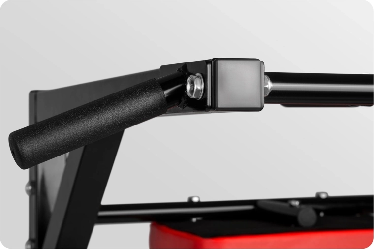 Wyściełane oparcia pleców i przedramion chronią podczas dipów i unoszenia nóg. Różne szerokości i kąty chwytu poszerzają zakres ćwiczeń.