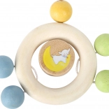 Drewniana grzechotka Lotta to idealna zabawka dla najmłodszych, która stymuluje zdolności motoryczne i słuch dzięki koralikom grzechoczącym o obręcz.