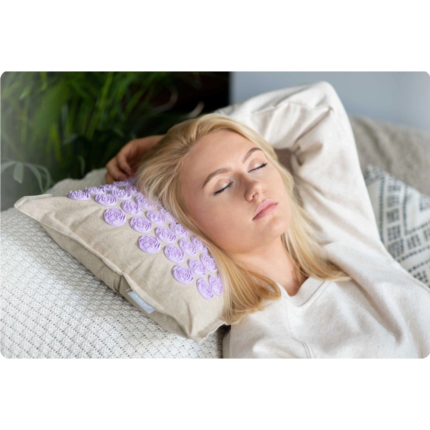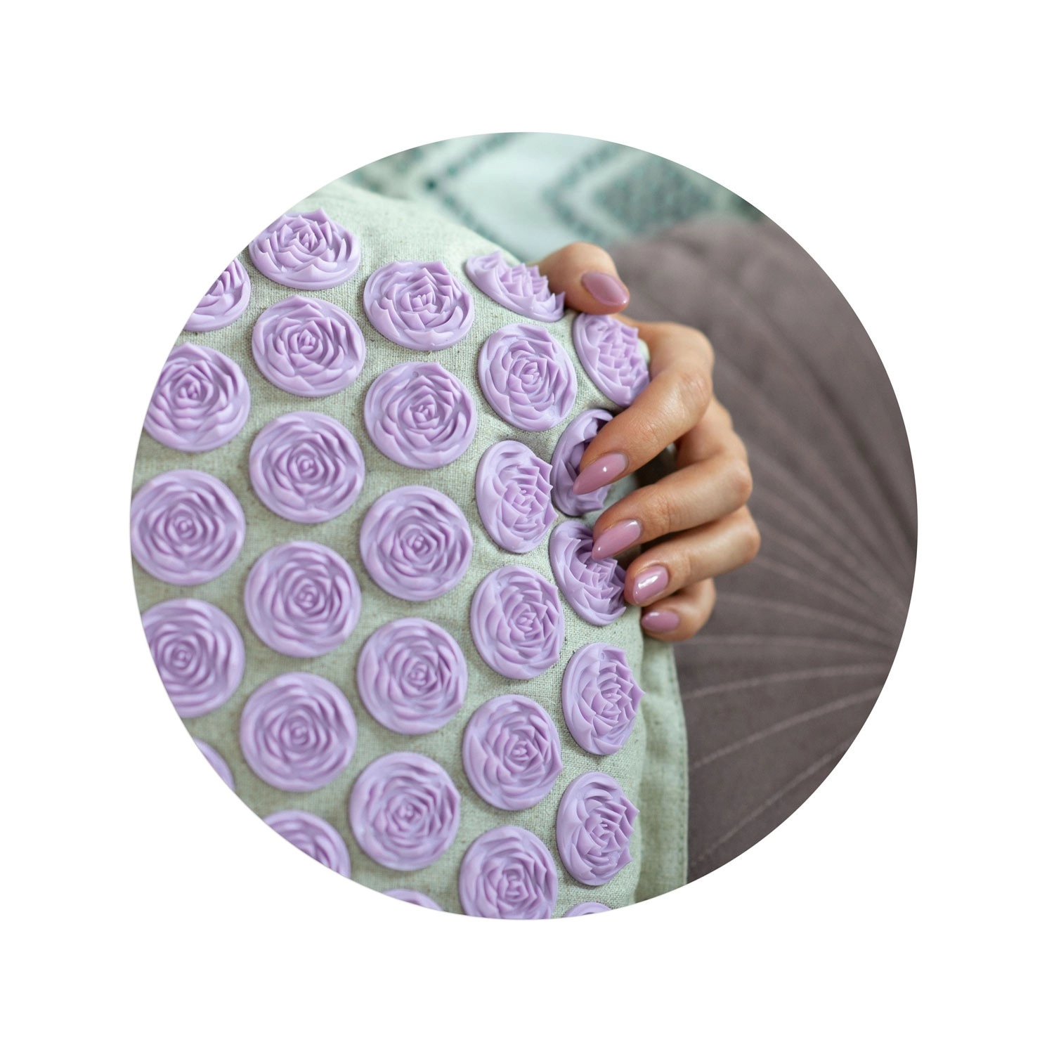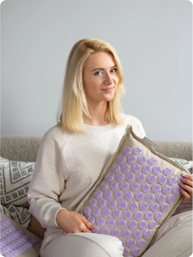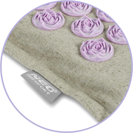 Gęste rozmieszczenie lawendowych dysków stymuluje punkty uciskowe na całej długości pleców i w okolicy karku. Wspiera krążenie, rozluźnia mięśnie i pomaga przy bólach pleców, karku oraz w stresie.