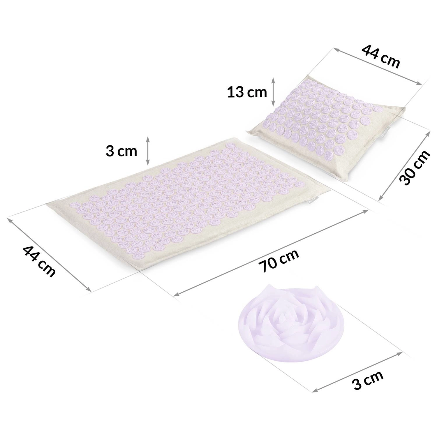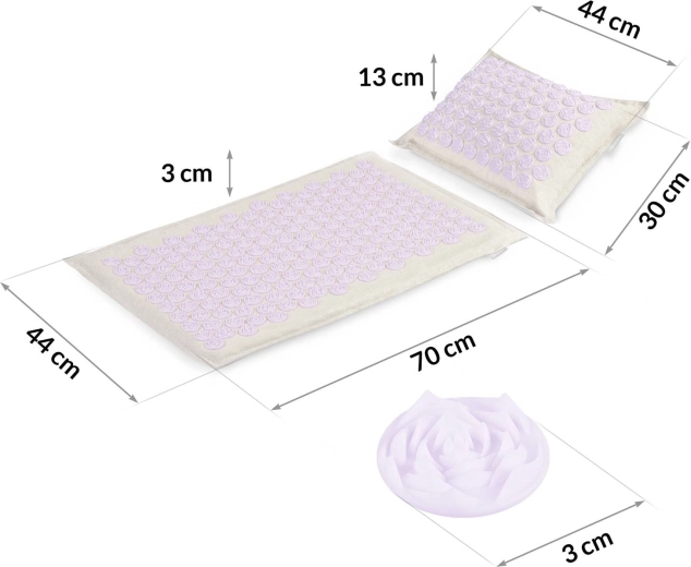 - Intensywna akupresura: 181 dysków na macie + 76 na poduszce do celowanego działania na plecy, kark i głowę.