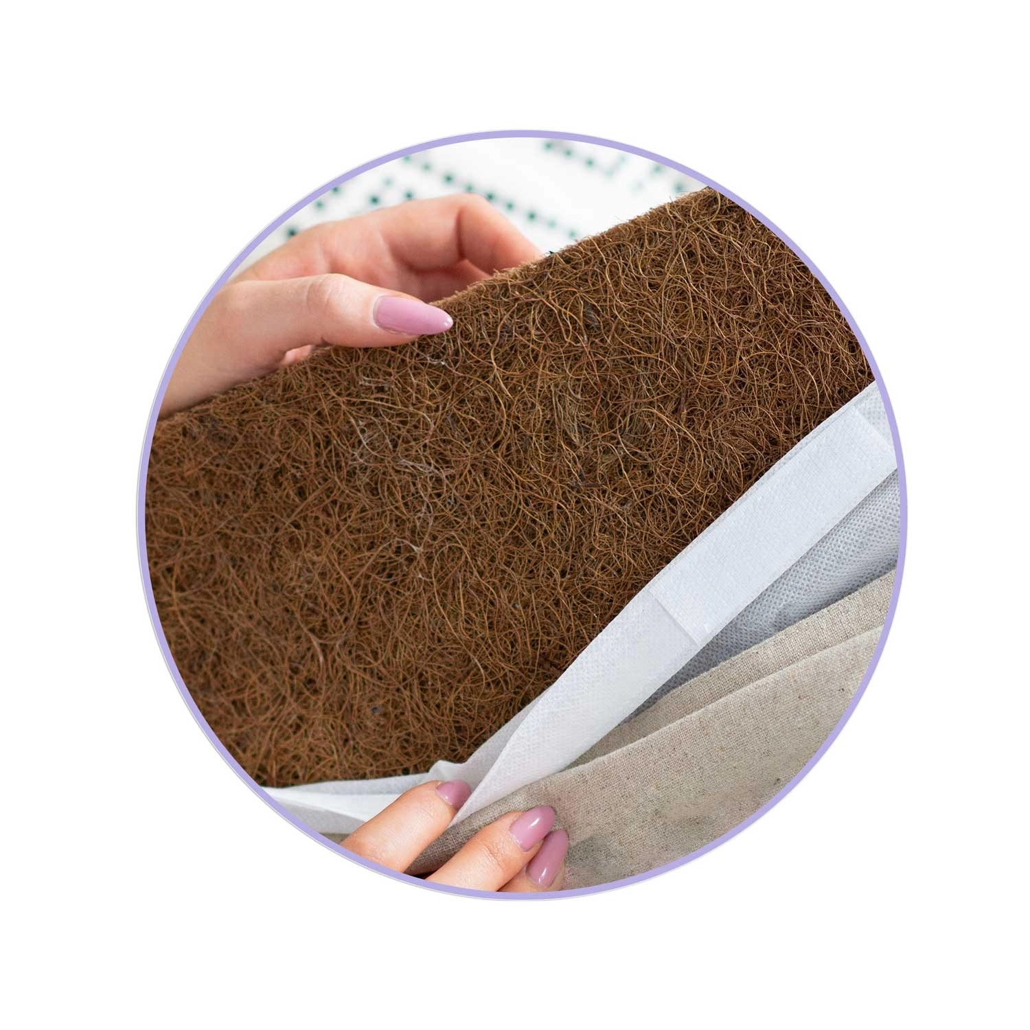 Wypełnienie z włókna kokosowego jest higieniczne i trwałe w kształcie. Zewnętrzny pokrowiec z 50% lnu i 50% bawełny jest przyjemny w dotyku i dobrze odprowadza ciepło.