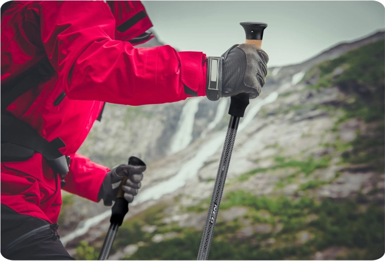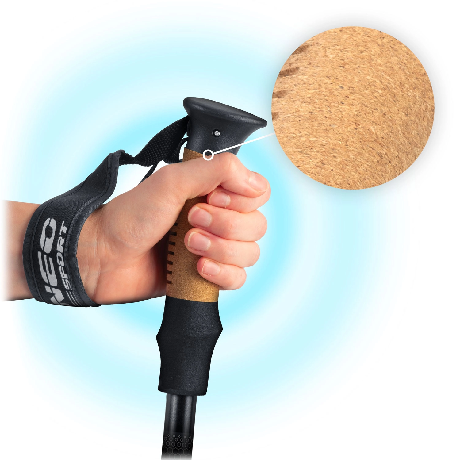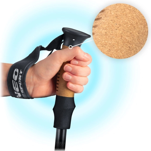 Ergonomiczna rękojeść z naturalnego korka pozostaje przyjemna w dotyku w upale i chłodzie, odprowadza wilgoć i wraz z miękką, regulowaną pętlą zmniejsza zmęczenie dłoni podczas długich wędrówek.