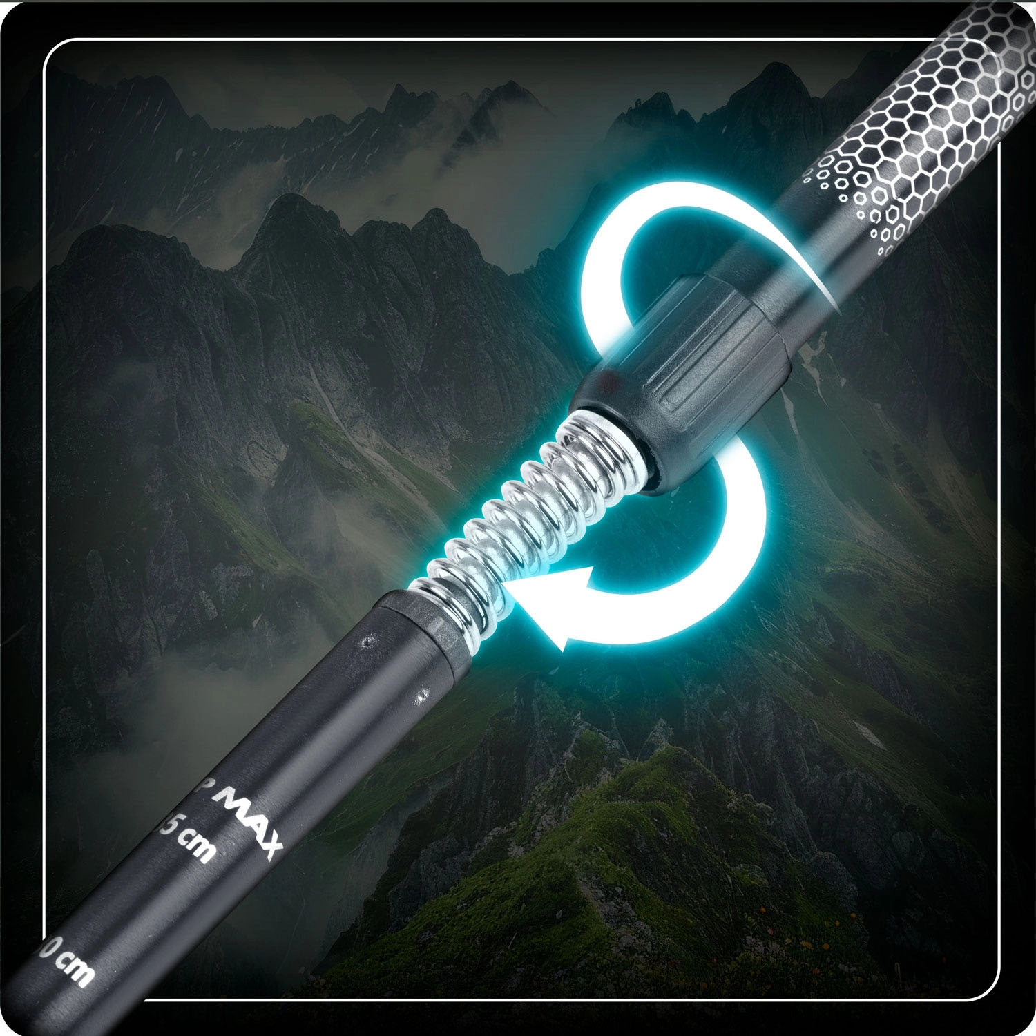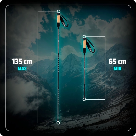 - Teleskopowa regulacja 65–135 cm – szybkie dopasowanie do każdego terenu