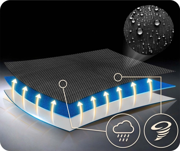 Wytrzymała tkanina odporna na deszcz i intensywne użytkowanie zachowuje kształt oraz kolory, a czyszczenie zajmuje zaledwie chwilę.