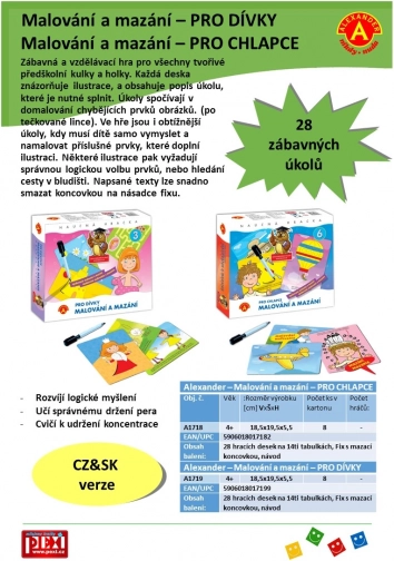 Zabawna gra edukacyjna dla przedszkolaków z 28 zadaniami na 14 laminowanych tablicach oraz mazakiem z końcówką do ścierania. Dzieci podczas zabawy ćwiczą motorykę małą, myślenie logiczne i prawidłowy chwyt pisarski. Łatwe pisanie i ścieranie wspiera kreatywność, koncentrację i przygotowanie do pisania w szkole.