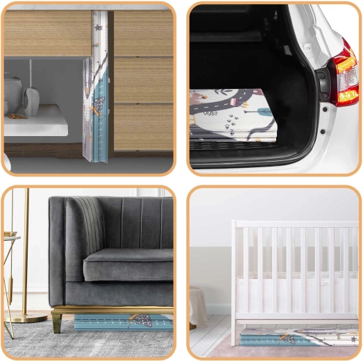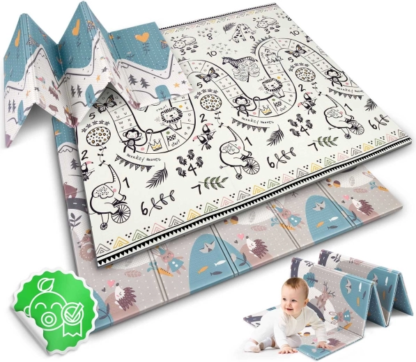Odkryj praktyczną i elegancką przestrzeń do zabawy dla niemowląt i przedszkolaków. Dwustronny design z edukacyjnymi motywami zachęca do poznawania liczb, zwierzątek i kształtów, a miękka pianka XPE dodaje pewności przy pierwszych próbach raczkowania i chodzenia. Mata składa się akordeonowo, więc szybko ją przeniesiesz, włożysz do samochodu lub wsuniesz pod łóżko.