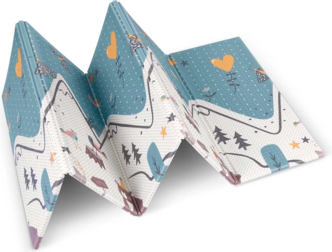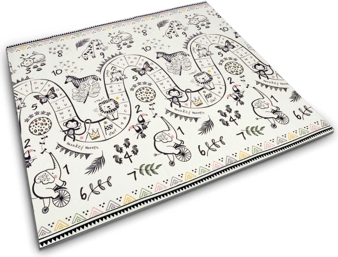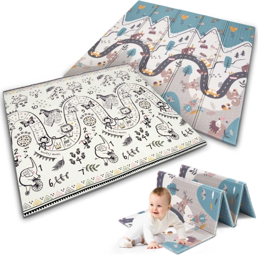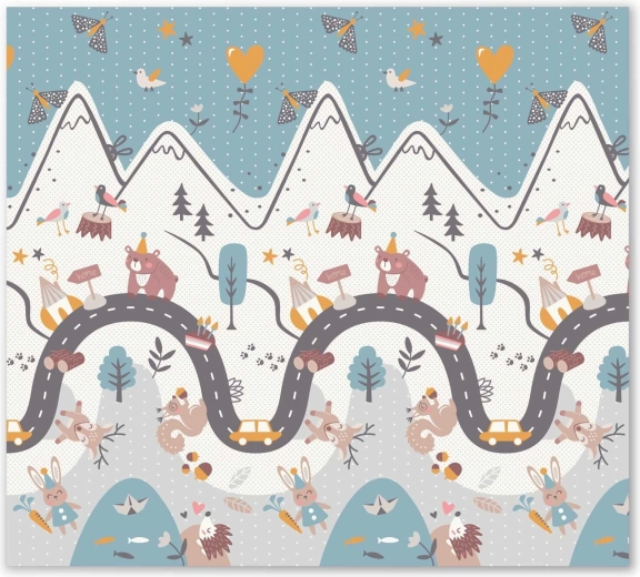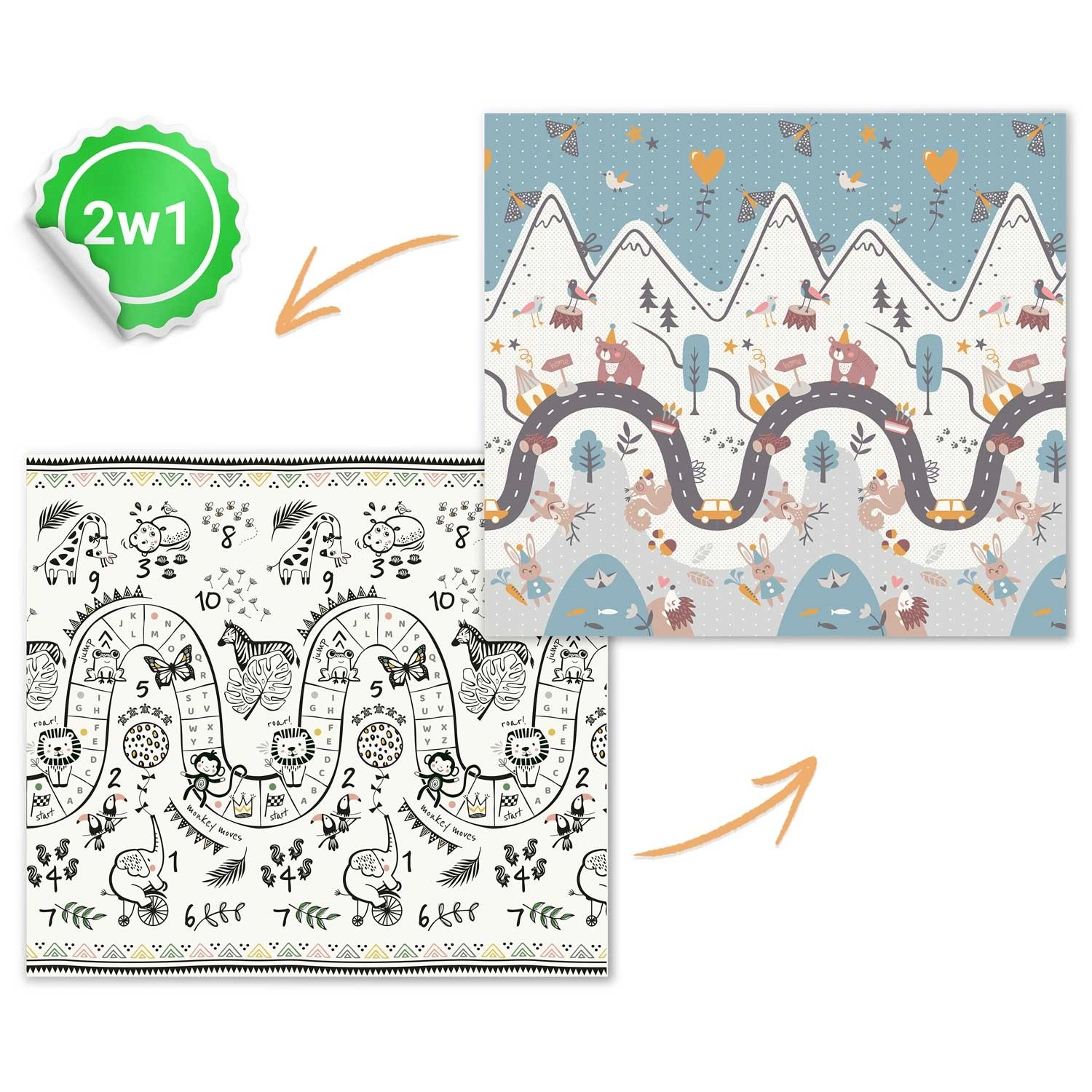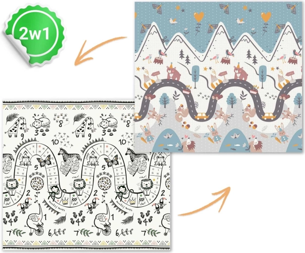 Jedna strona z kolorową drogą w górach, druga z kontrastowymi liczbami i zwierzątkami do radosnej nauki. Wystarczy odwrócić matę, aby odmienić atmosferę kącika zabaw.