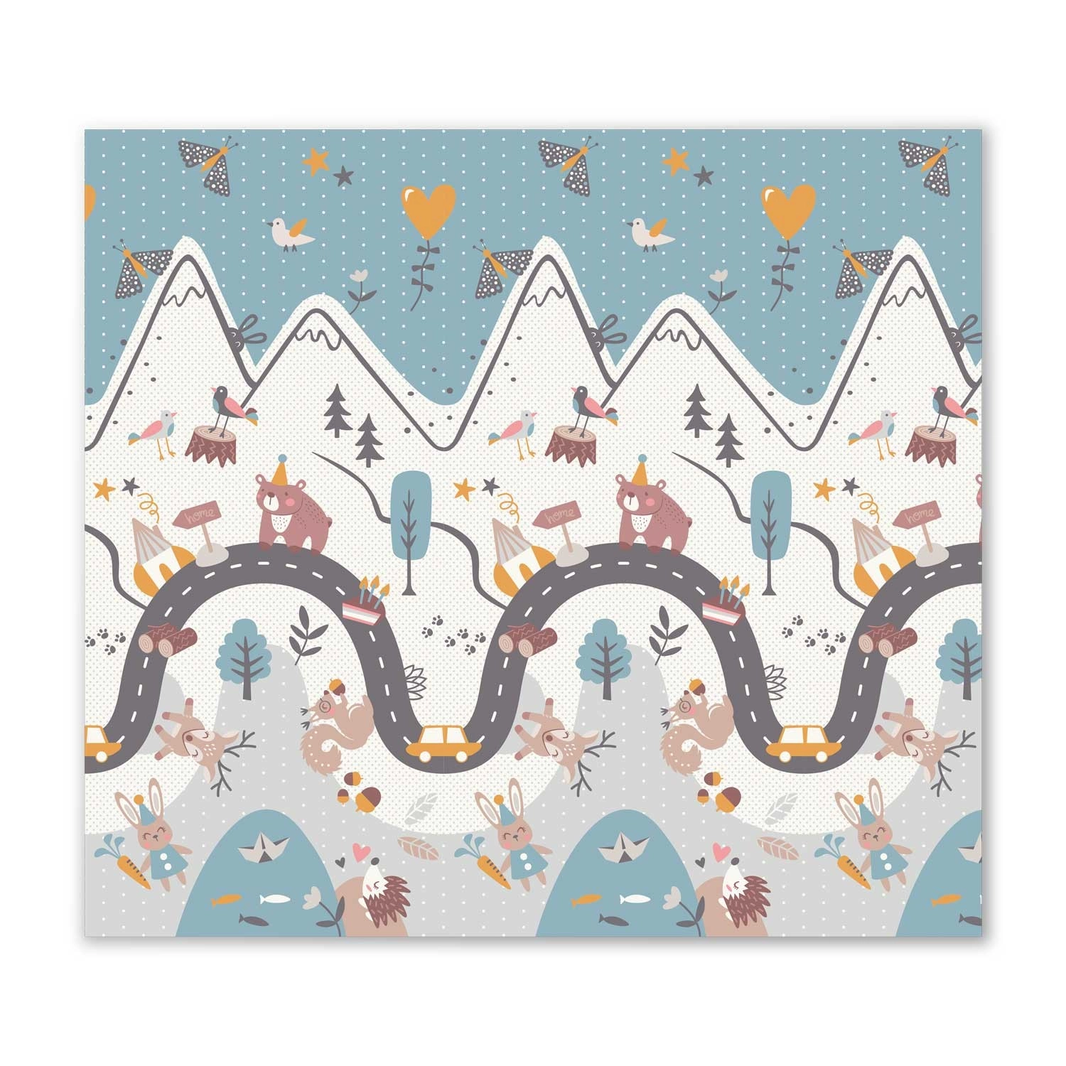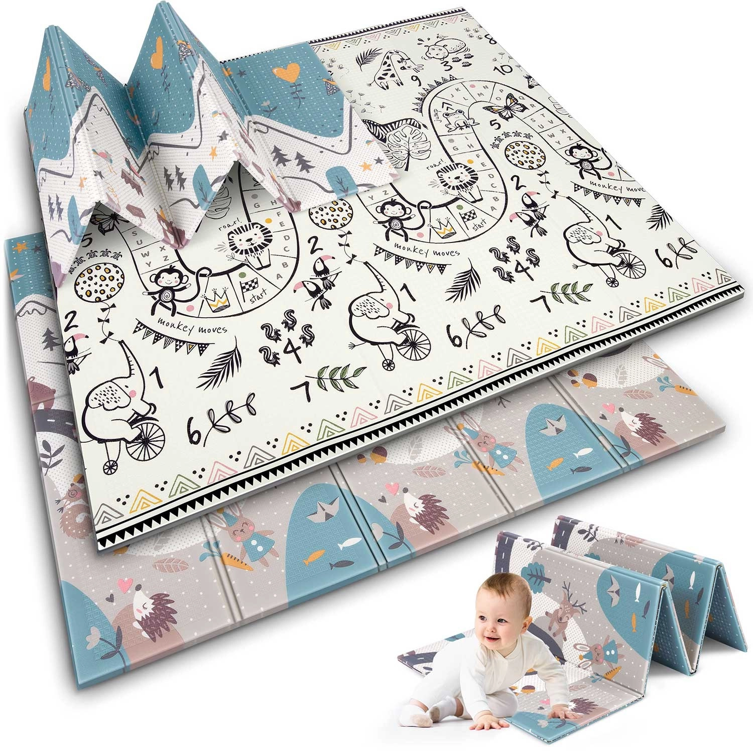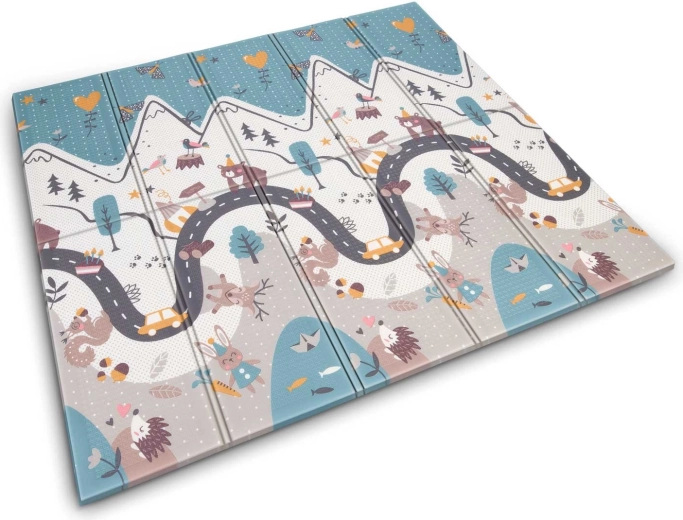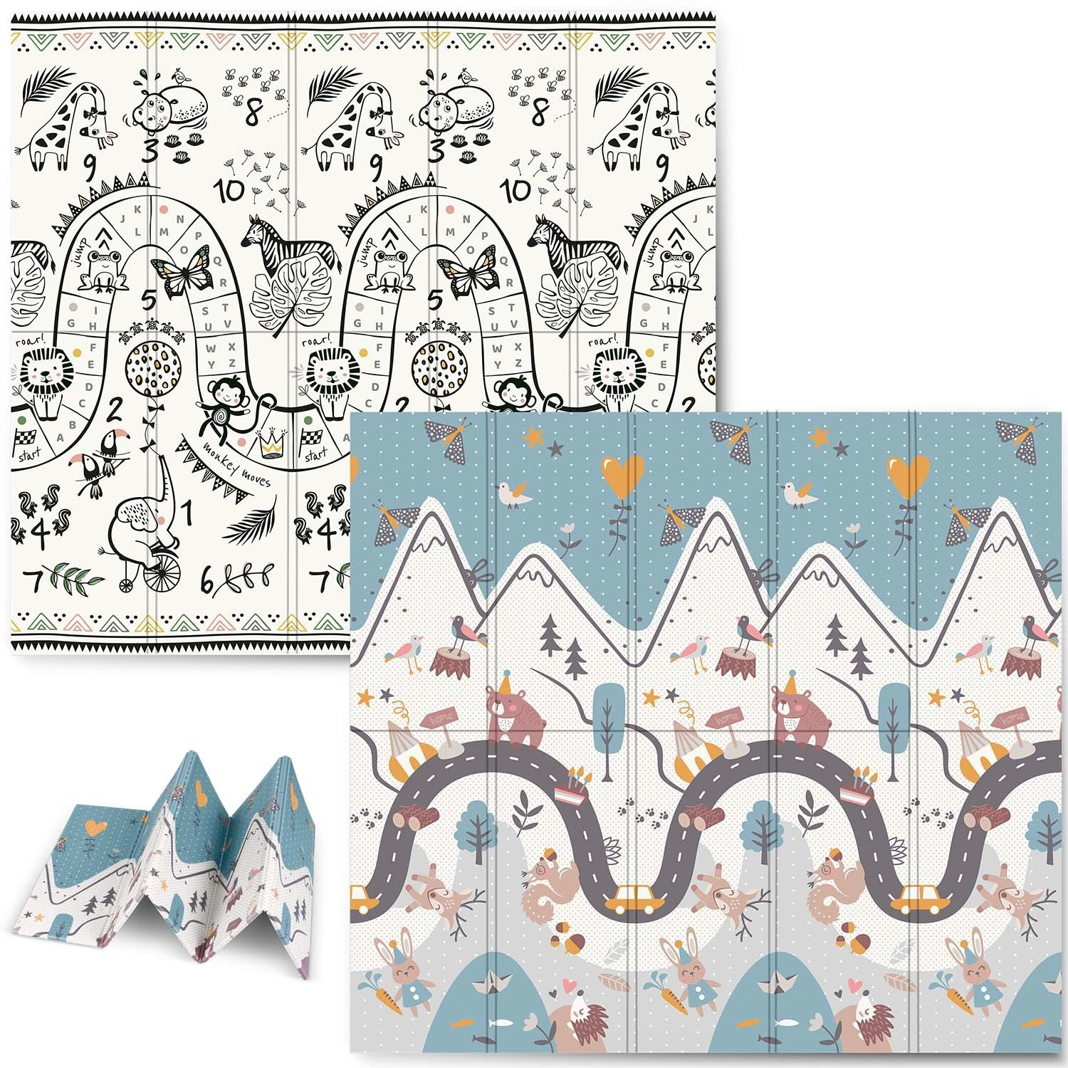 Jedna strona z kolorową drogą w górach, druga z kontrastowymi liczbami i zwierzątkami do radosnej nauki. Wystarczy odwrócić matę, aby odmienić atmosferę kącika zabaw.