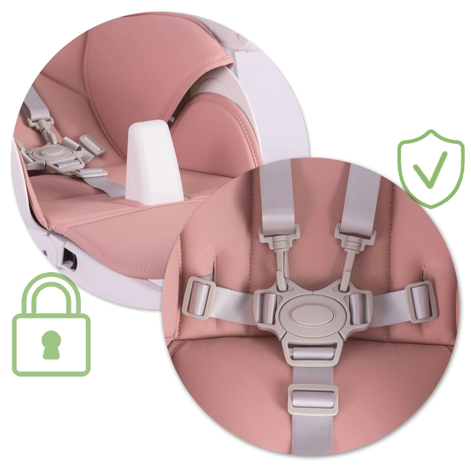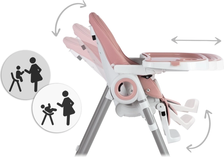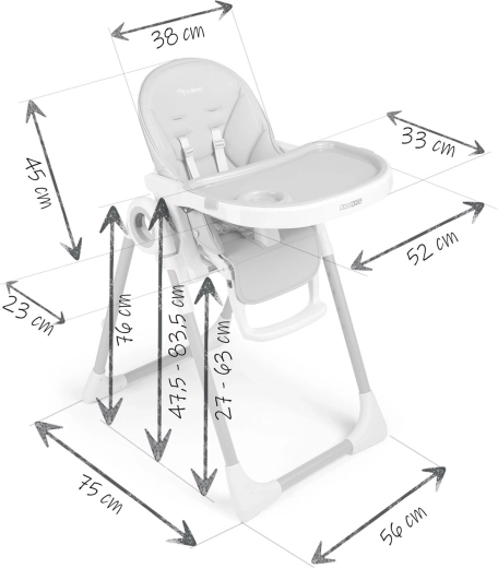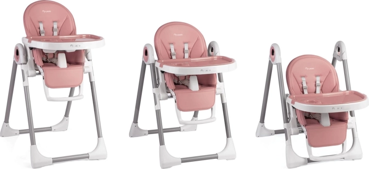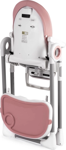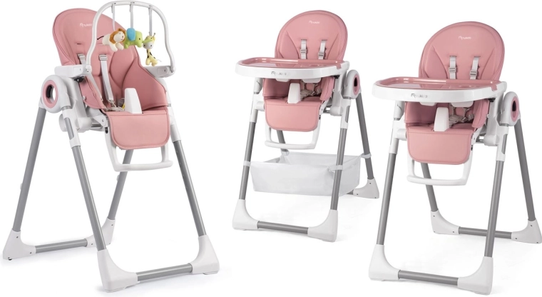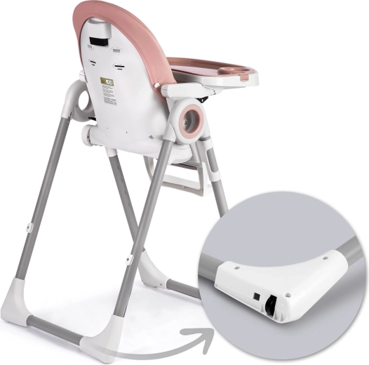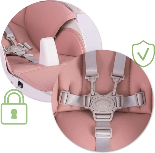 Bezpieczeństwo zapewniają 5‑punktowe pasy bezpieczeństwa oraz stabilna metalowa rama z antypoślizgowymi zakończeniami. Tylne kółka umożliwiają łatwe przemieszczanie po mieszkaniu, a kompaktowy mechanizm składania oszczędza miejsce podczas przechowywania. Tapicerka z trwałego, łatwego w utrzymaniu materiału wystarczy po posiłku po prostu przetrzeć.