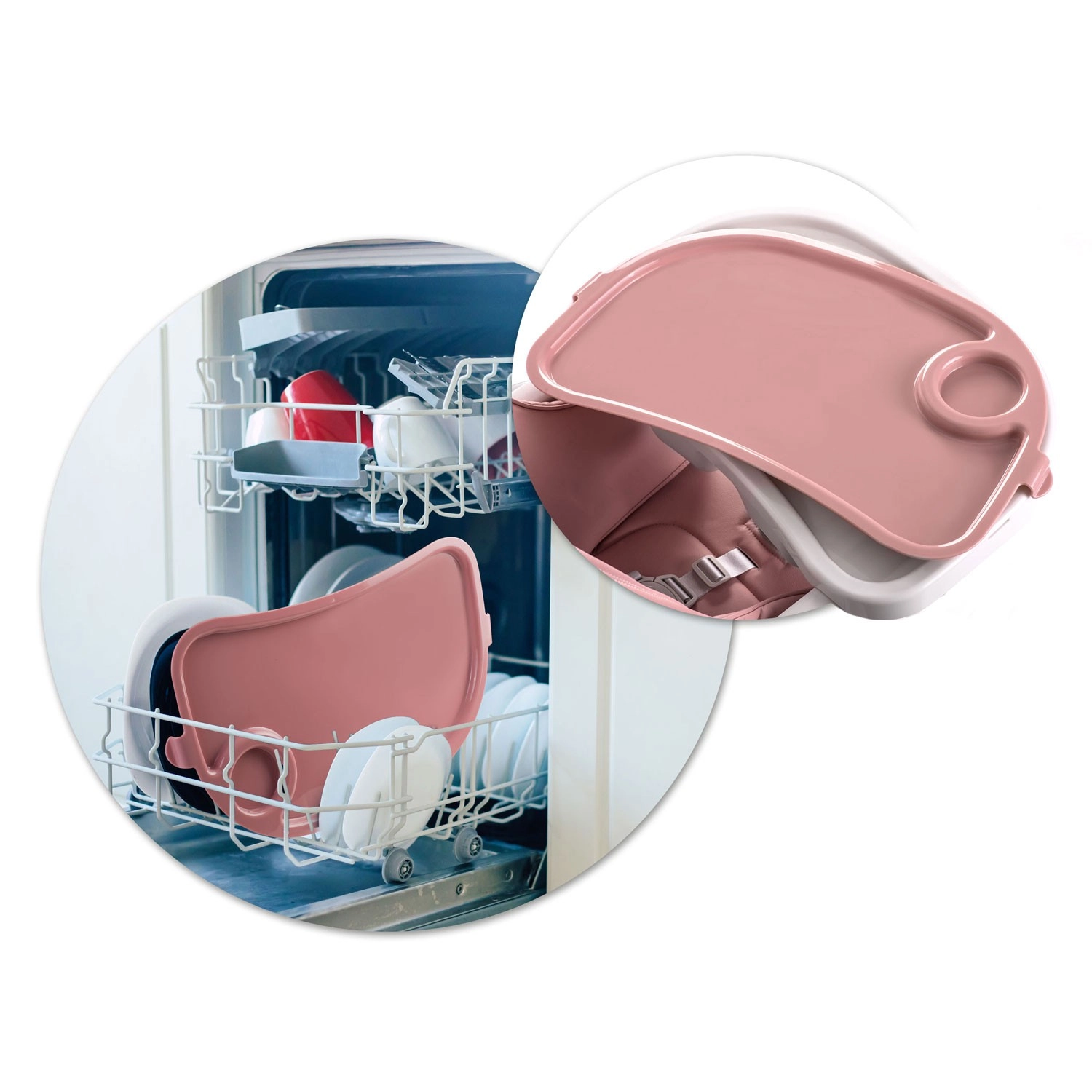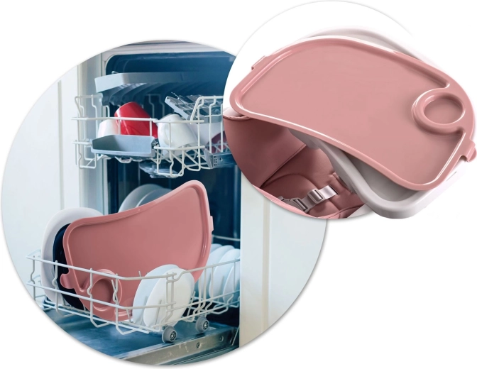 Tacka z podwyższonymi krawędziami jest odpinana, a jej górną wkładkę można myć pod bieżącą wodą lub w zmywarce – sprzątanie po posiłku zajmuje chwilę.