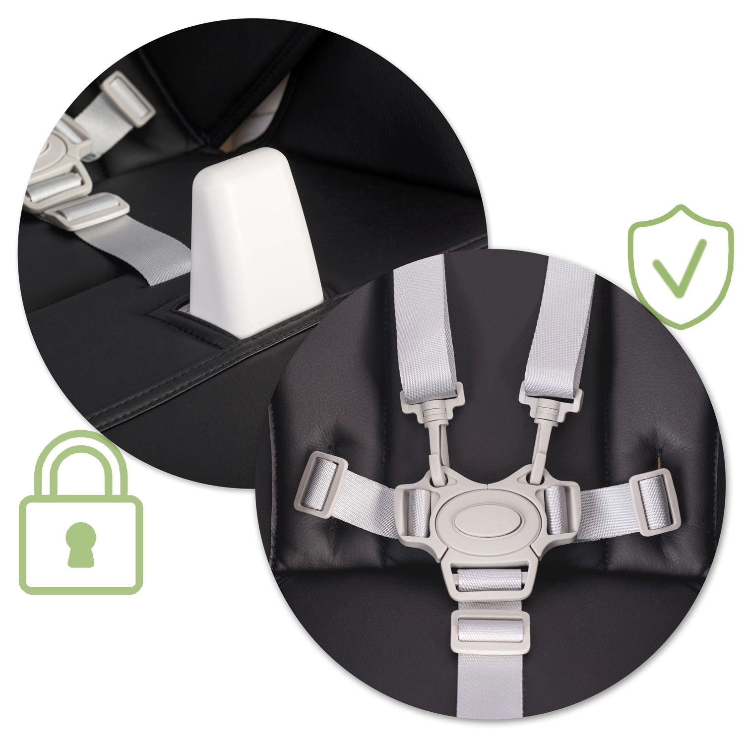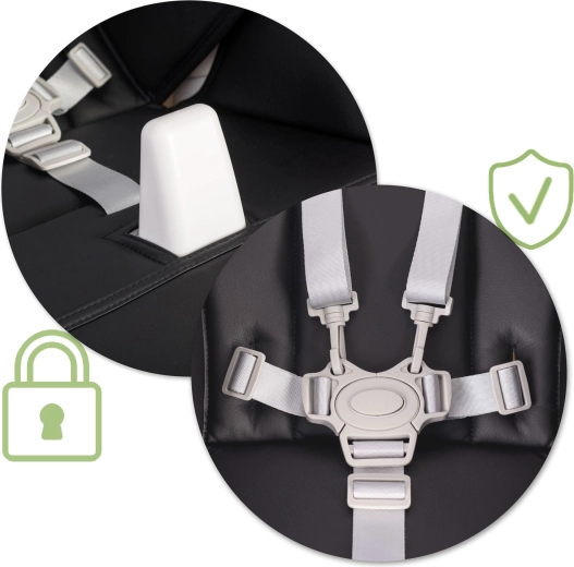 Regulowane 5-punktowe pasy oraz środkowy pas kroczny pewnie utrzymują dziecko w bezpiecznej pozycji i zapobiegają samoczynnemu wysunięciu się z krzesełka.