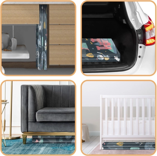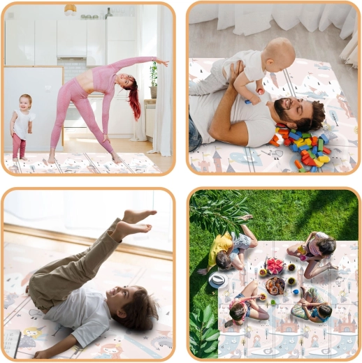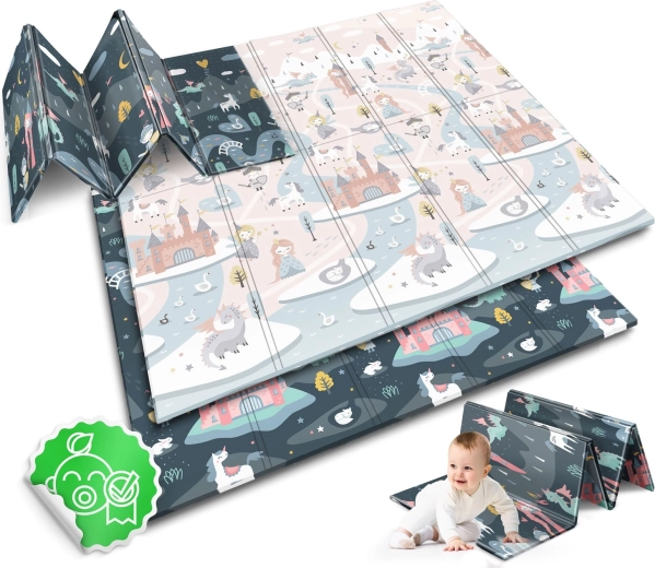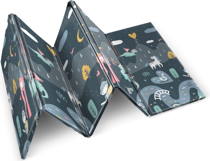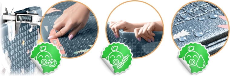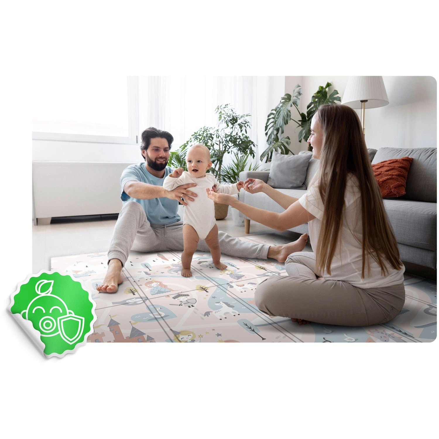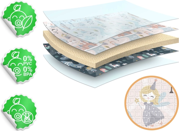 Mata szybko składa się w akordeon, łatwo ją przenosić i przechowywać pod łóżkiem lub w samochodzie. Wodoodporną powierzchnię wystarczy przetrzeć wilgotną ściereczką, co sprawdzi się w domu, w gościach i na zewnątrz podczas pikniku. Materiał jest bez BPA/PVC/ftalanów/formamidu, spełnia CE i testy EN71-1/2/3, więc możesz liczyć na sprawdzoną jakość i bezpieczeństwo.