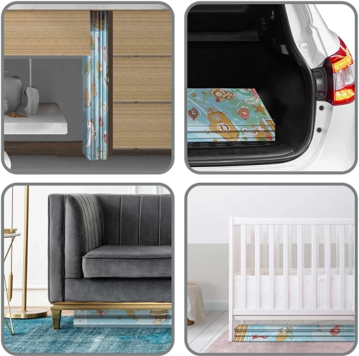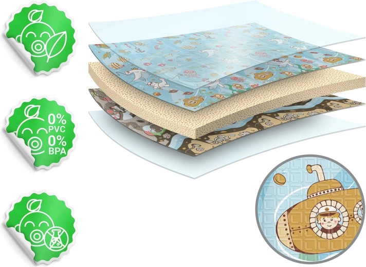 Mata jest składana w harmonijkę, lekka i przenośna – z łatwością zabierzesz ją na piknik, do salonu czy do ogrodu. Wodoodporna powierzchnia wymaga jedynie przetarcia wilgotną ściereczką, a teksturowanie antypoślizgowe zapewnia stabilność. Materiał nie zawiera szkodliwych substancji (BPA, PVC, ftalanów, formamidu) i spełnia rygorystyczne europejskie normy EN71-1/2/3 oraz CE.