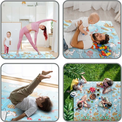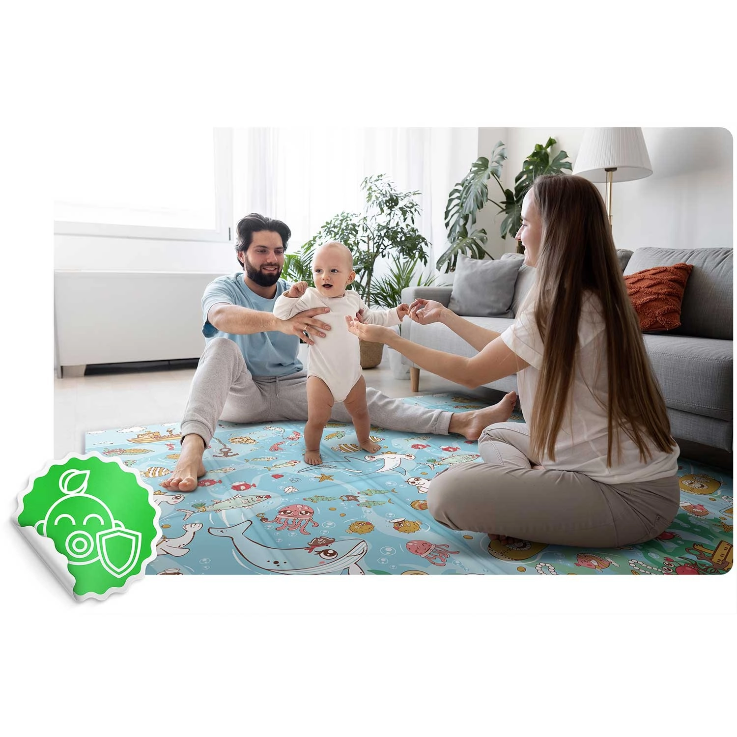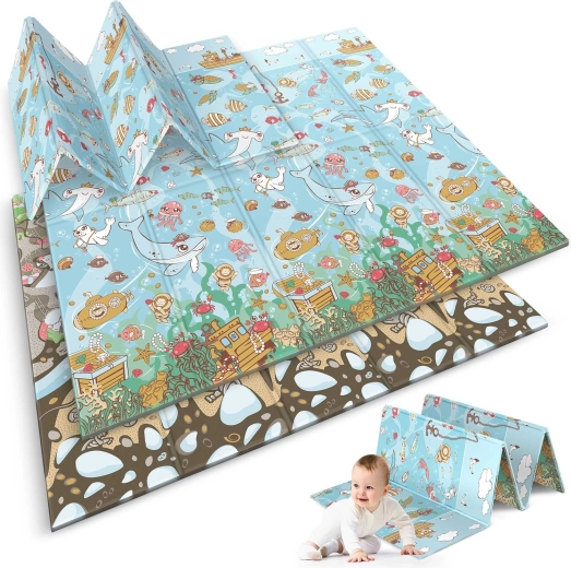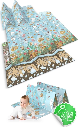 Duża składana piankowa mata NUKIDO o wymiarach 200 × 180 × 1 cm zapewni dzieciom maksymalny komfort i bezpieczeństwo podczas zabawy i pierwszych kroków. Jest dwustronna (motyw oceanu i lasu), wodoodporna, łatwa w czyszczeniu, a dzięki 1 cm grubości z pianki XPE doskonale amortyzuje uderzenia. Ma antypoślizgową powierzchnię, nie zawiera BPA, PVC, ftalanów ani formamidu i spełnia europejskie normy bezpieczeństwa, w tym EN71 oraz oznaczenie CE.