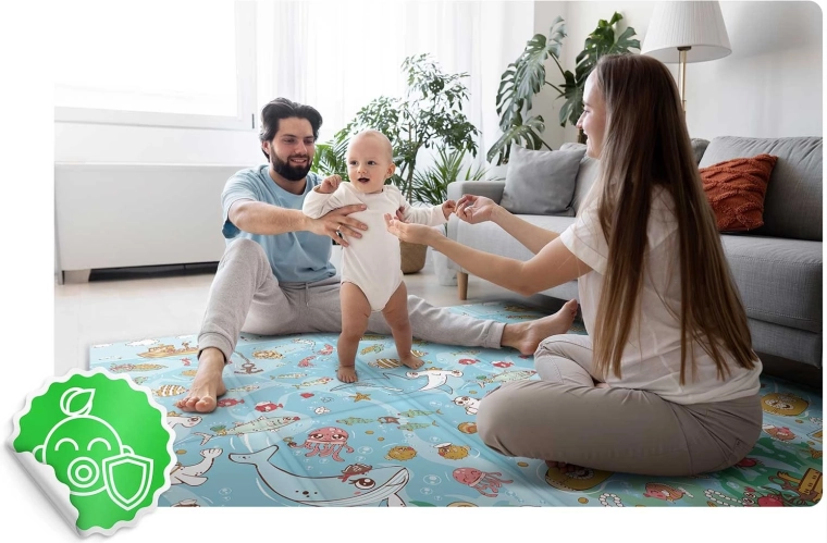 Gruba, miękka i wytrzymała warstwa tłumi upadki, jest bezzapachowa i hipoalergiczna. Tekstura antypoślizgowa zwiększa stabilność podczas raczkowania i pierwszych kroków.