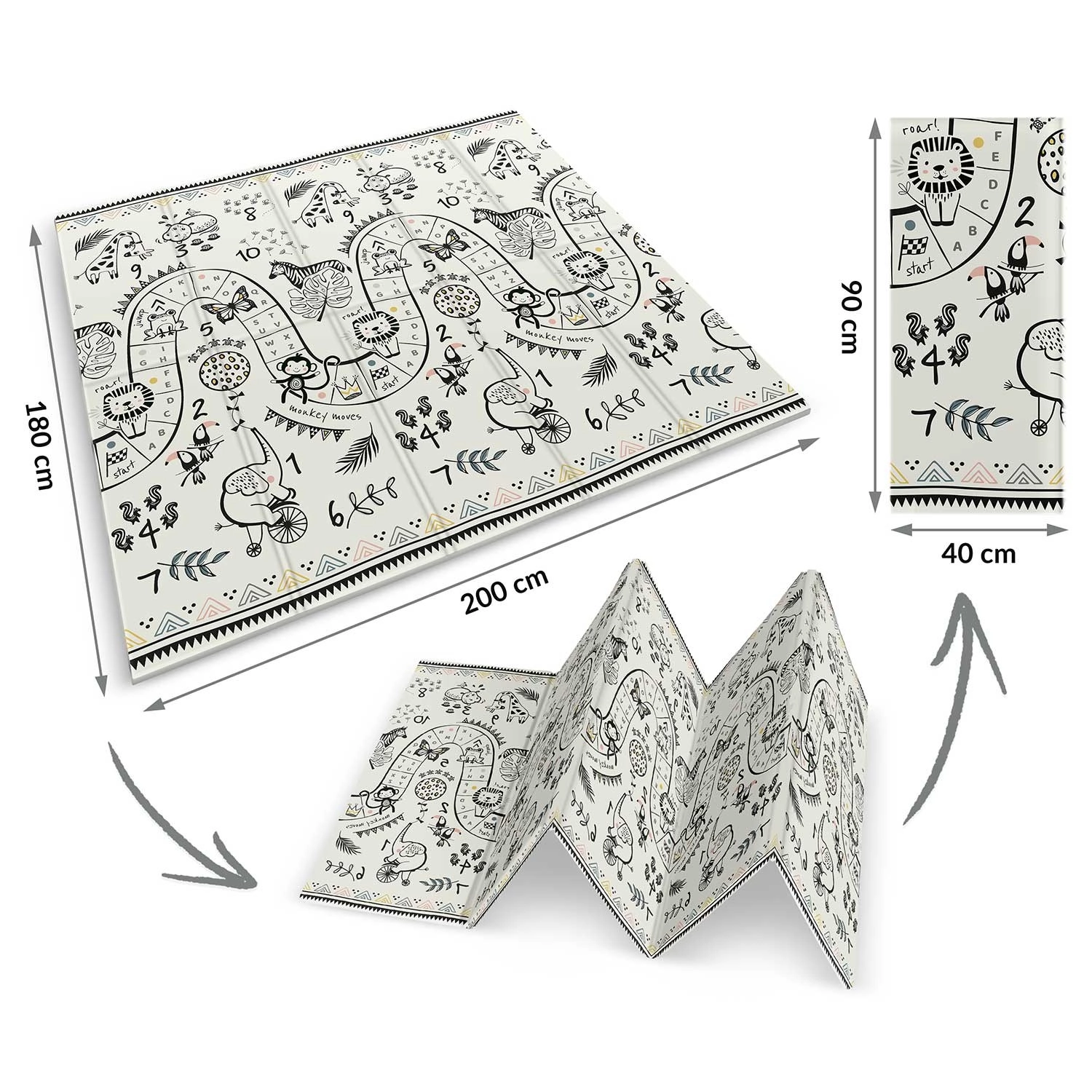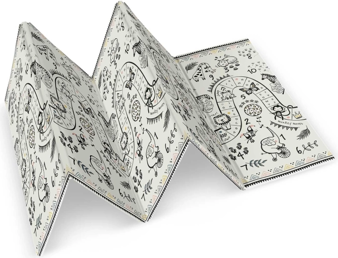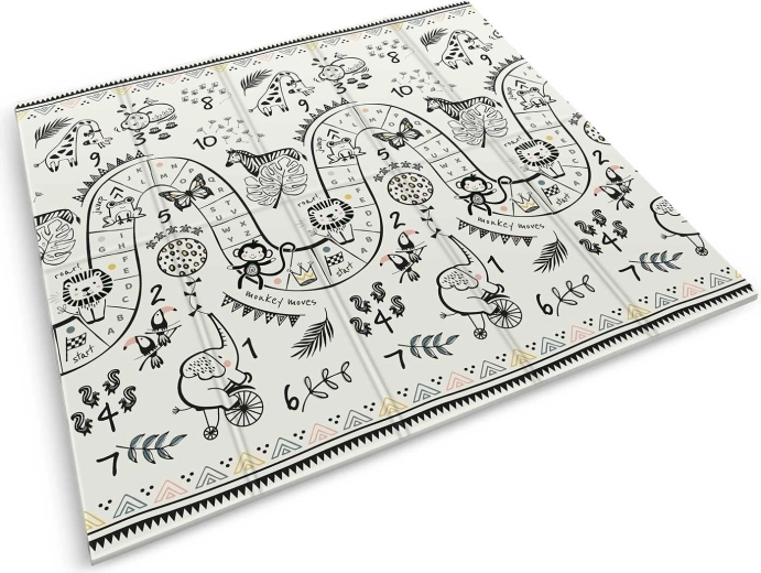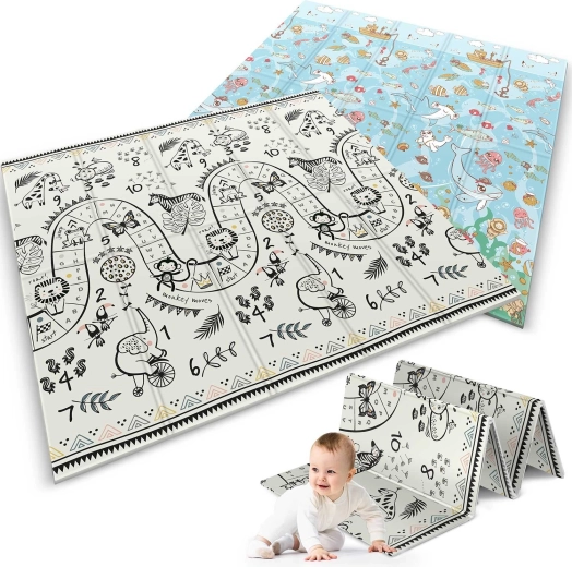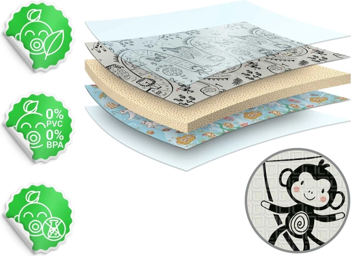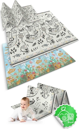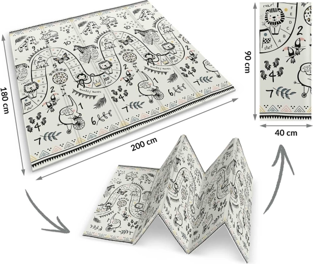 Mata składa się akordeonowo, więc łatwo ją przeniesiesz, schowasz pod łóżko lub do auta i zabierzesz w odwiedziny, do sali zabaw czy na piknik. Wysokiej jakości gorące prasowanie zwiększa trwałość, krawędzie się nie strzępią, a materiał jest bezzapachowy i bez alergenów.