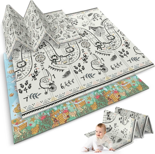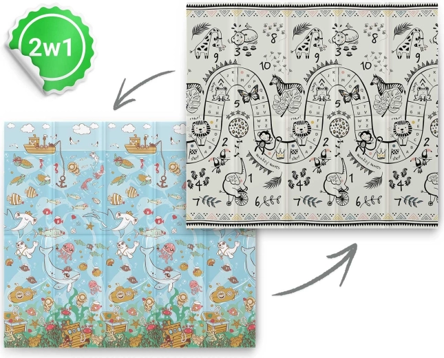 Jedna strona z podwodnym światem, druga z czarno‑białą trasą do zabawy i zwierzętami. Wspiera naukę liczb, koordynację i rozwój sensoryczny dzieci w różnym wieku.