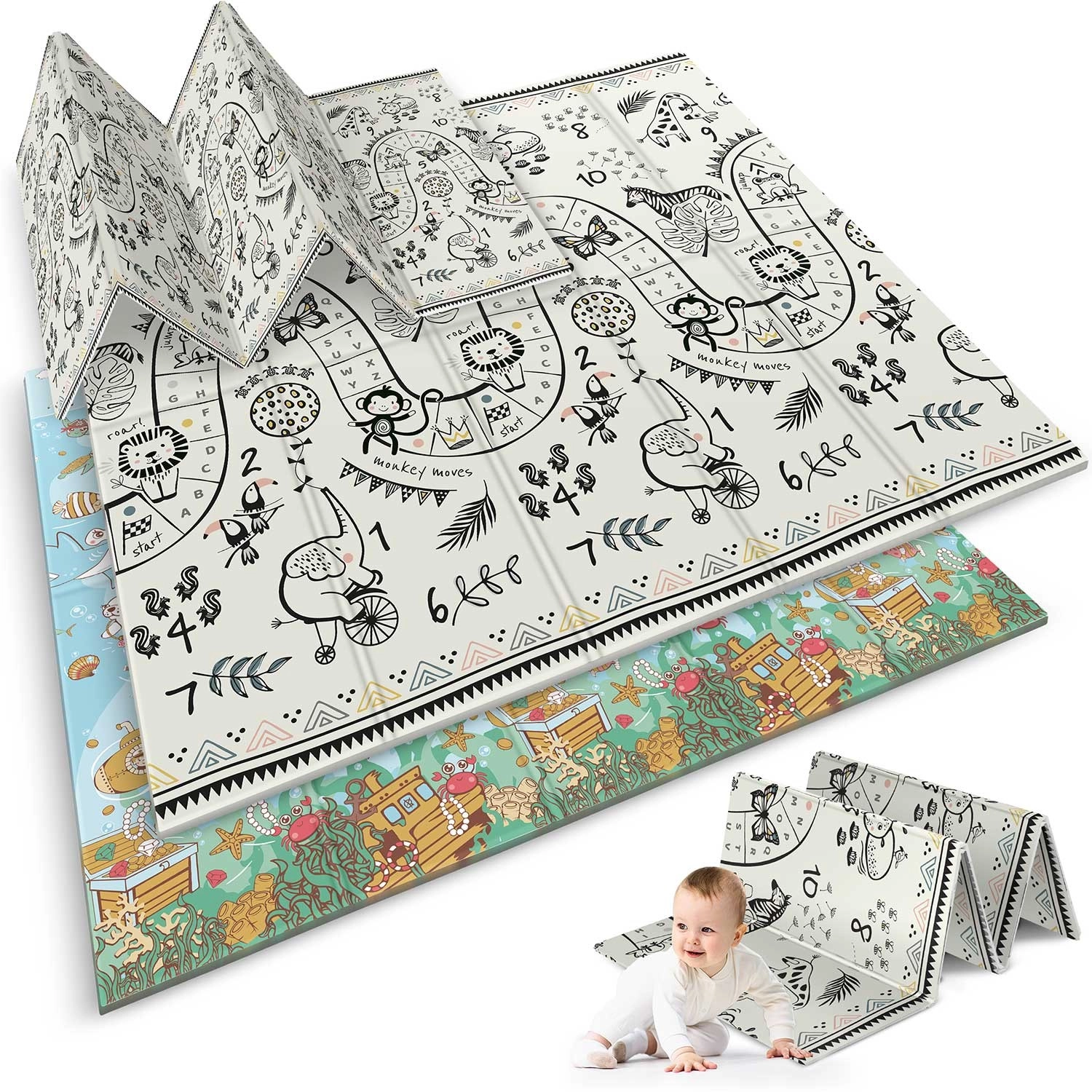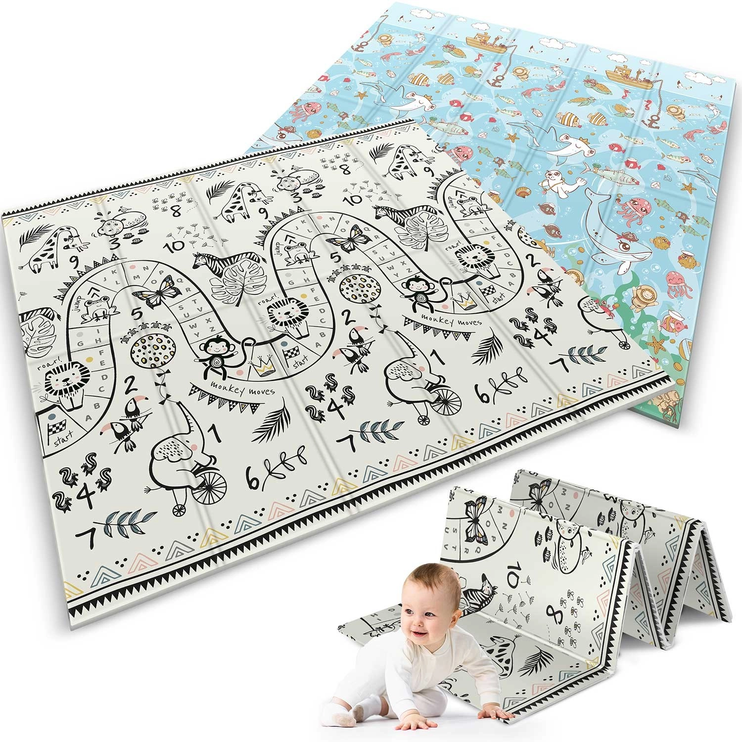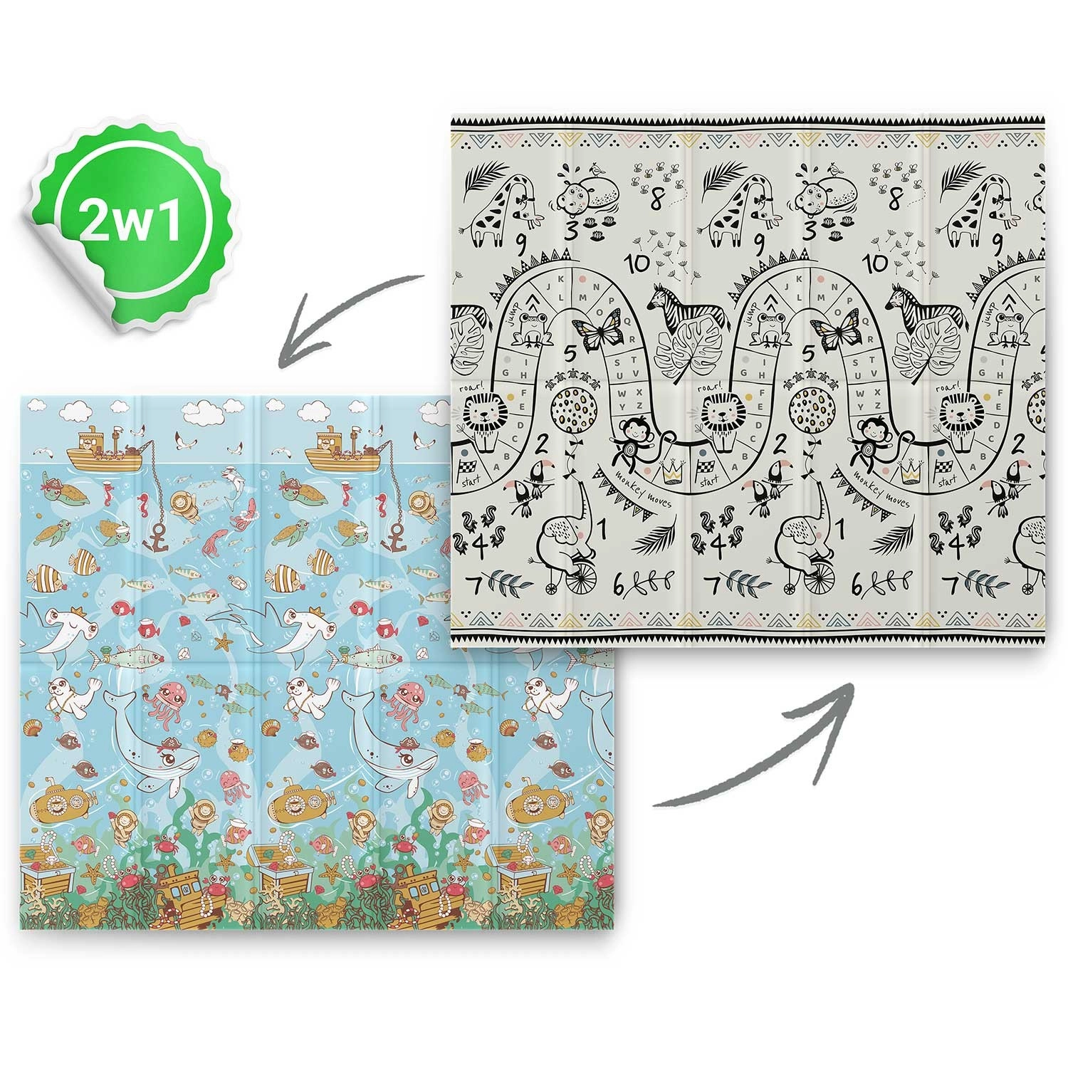 - Design 2 w 1: dwustronny nadruk – kolorowy ocean i czarno‑biała trasa do zabawy ze zwierzętami i liczbami.