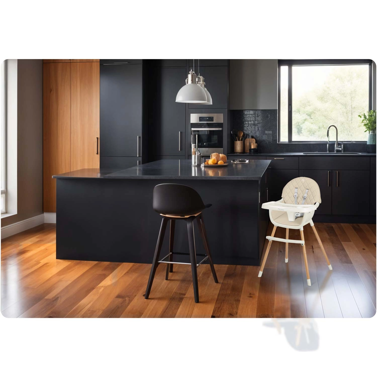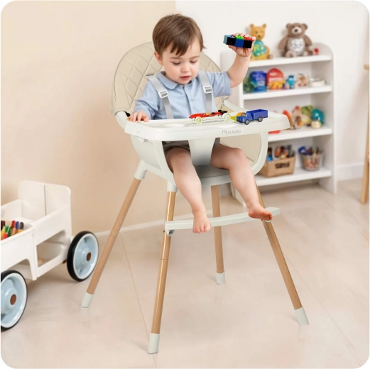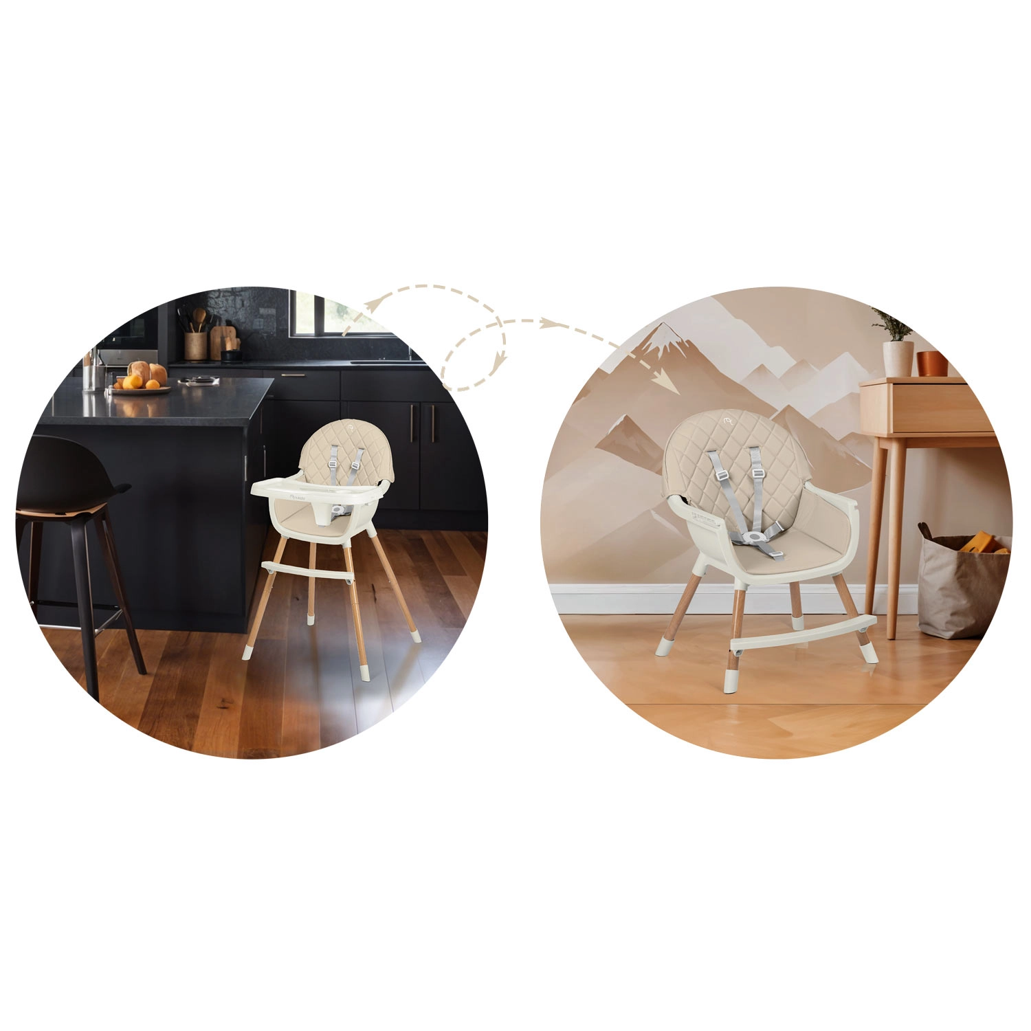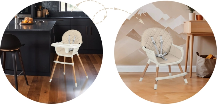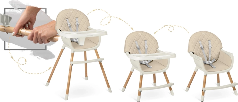 NUKIDO Lilo to praktyczne krzesełko 3 w 1, które rośnie razem z dzieckiem i zapewnia bezpieczne, wygodne siedzenie od pierwszych przecierów aż po kreatywne aktywności. Odpinany blat z wkładką można łatwo umyć pod bieżącą wodą i w zmywarce, a miękką tapicerkę wystarczy po prostu przetrzeć. Stabilna konstrukcja z nogami w wyglądzie drewna i solidnym podnóżkiem gwarantuje pewność przy codziennym użytkowaniu.