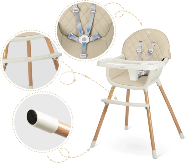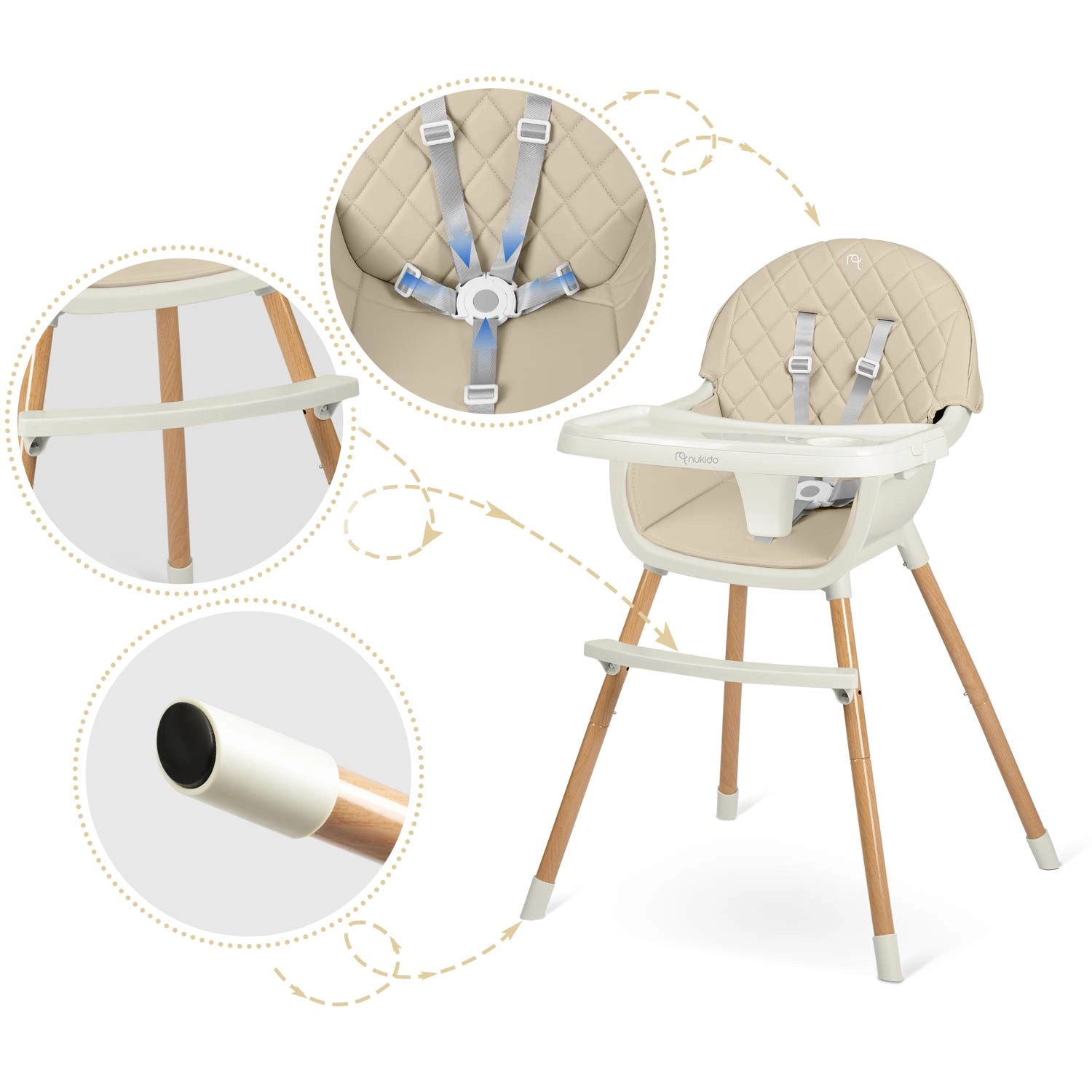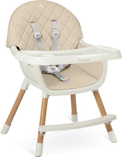 Stylowe i bezpieczne krzesełko do karmienia NUKIDO Lilo w kolorze beżowym łączy wygodę, stabilność i łatwą pielęgnację. Oferuje odpinany i regulowany blat z podwyższonymi krawędziami, 5‑punktowe pasy bezpieczeństwa, stabilne nogi z antypoślizgowymi zakończeniami oraz komfortowe siedzisko, które nie wchłania zabrudzeń. Idealne do karmienia, zabawy i nauki.