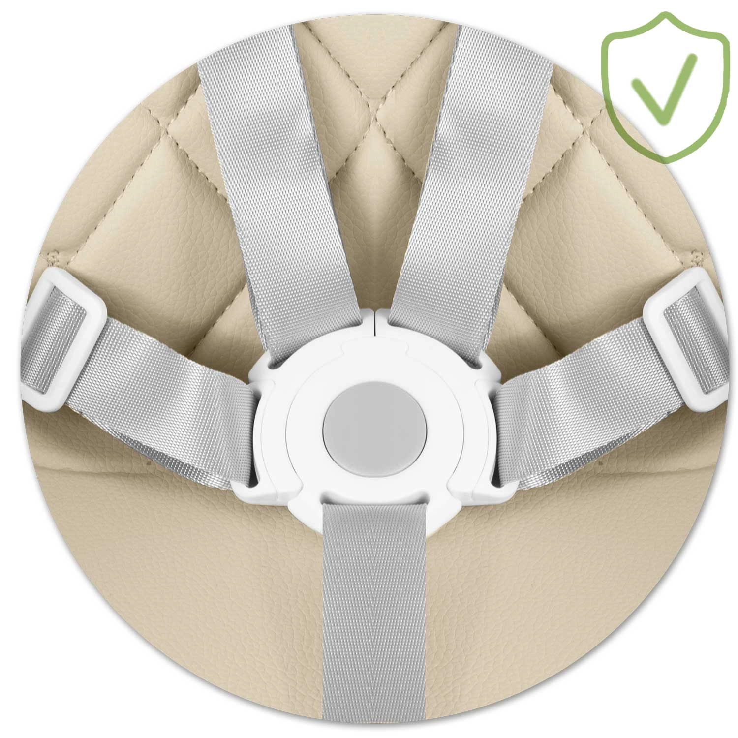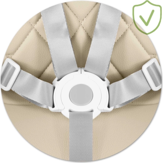 Regulowane 5‑punktowe pasy utrzymują dziecko w bezpiecznej pozycji i spełniają rygorystyczną normę EN 14988. Można je później całkowicie zdemontować.