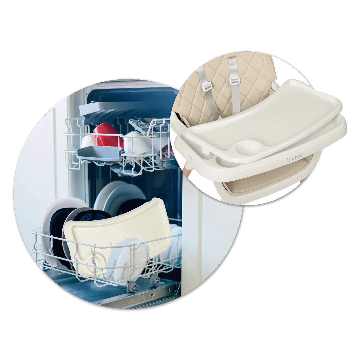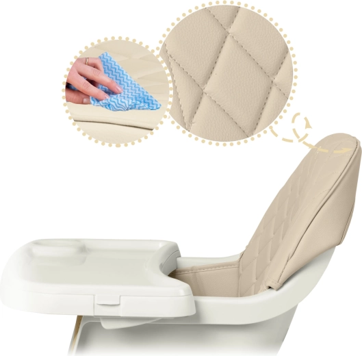Odpinany blat z podwyższonymi krawędziami i wyjmowaną wkładką łatwo umyjesz pod wodą lub w zmywarce. Tapicerka nie wchłania zabrudzeń – wystarczy przetrzeć.