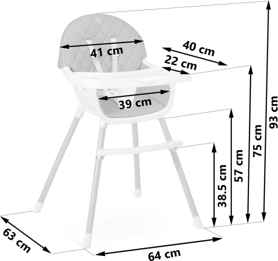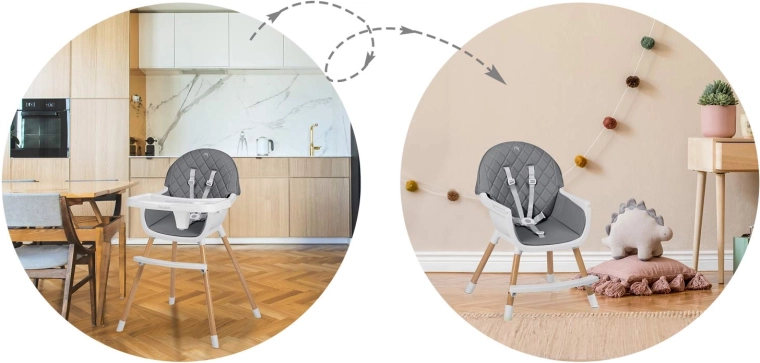 Regulowana i odpinana tacka, solidny podnóżek oraz stabilna konstrukcja umożliwiają używanie jako wysokie krzesełko oraz niższy fotelik. Idealne do karmienia, rysowania, budowania klocków i czytania.