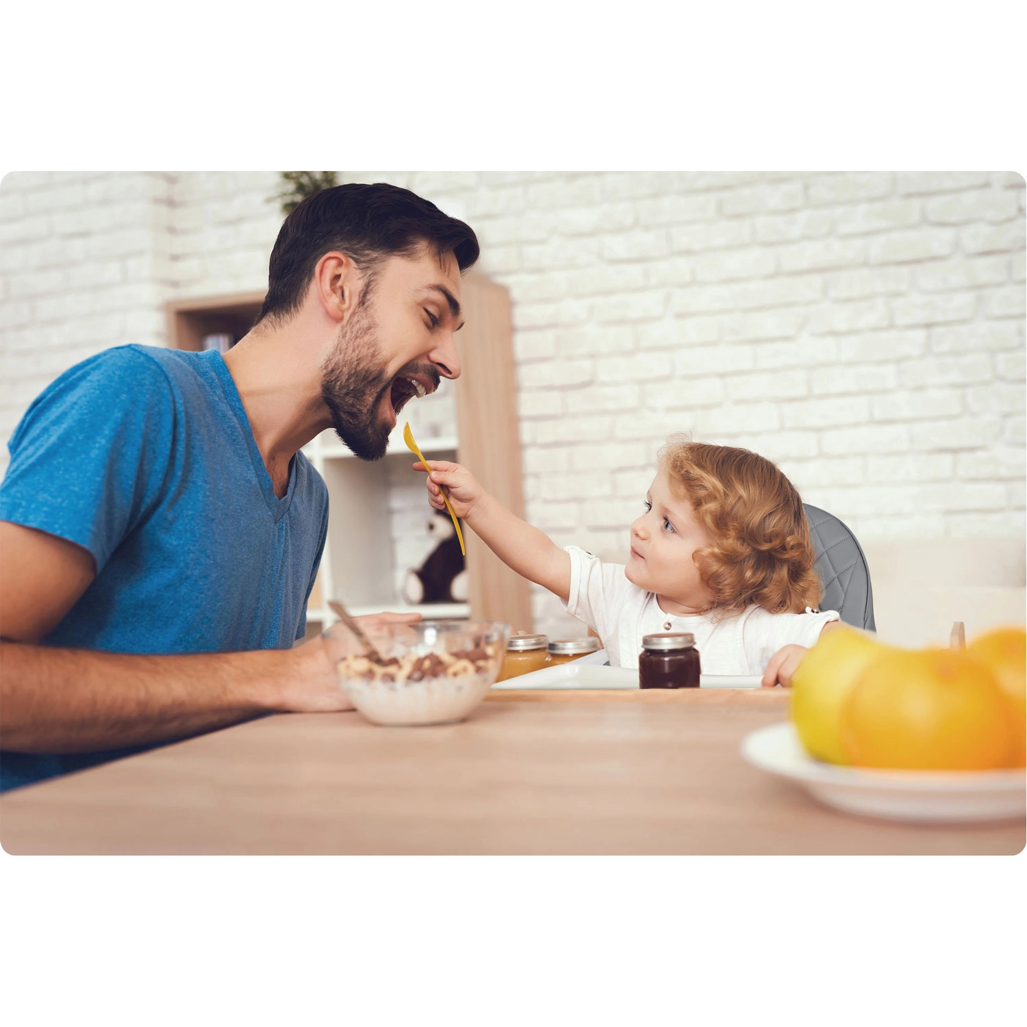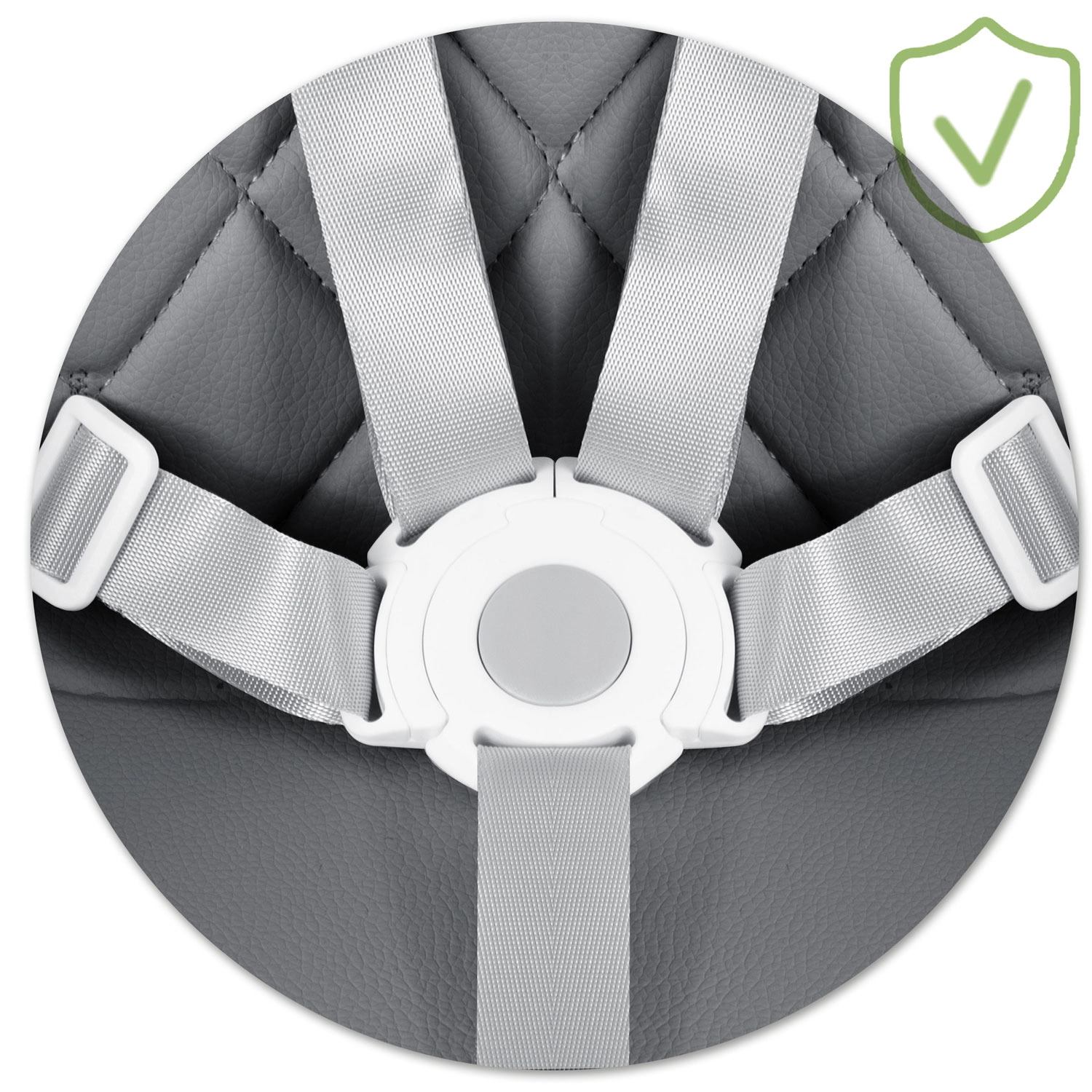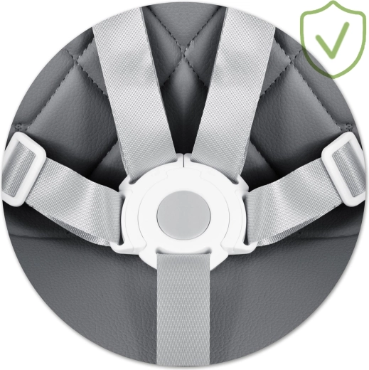 Zintegrowane 5‑punktowe pasy pewnie i wygodnie zabezpieczają dziecko w krzesełku, zapobiegając samoczynnemu wysunięciu. Krzesełko spełnia rygorystyczną europejską normę EN 14988, zapewniając spokój przy każdym posiłku i zabawie.