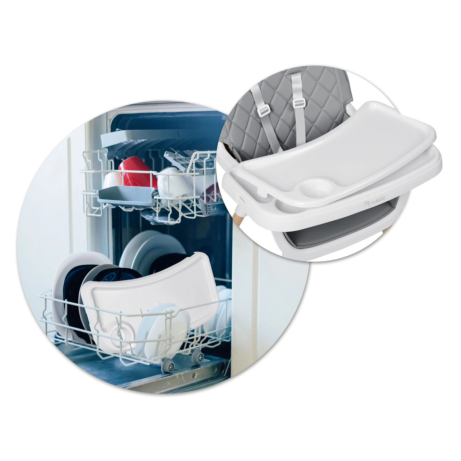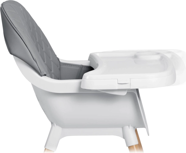 Pielęgnacja zajmuje chwilę: tackę z podwyższoną krawędzią można zdjąć i umyć pod bieżącą wodą lub w zmywarce, a tapicerkę z powierzchnią niechłonącą zabrudzeń wystarczy przetrzeć wilgotną ściereczką. Stabilne stalowe nogi z dekorem drewna oraz antypoślizgowe stopki zapewniają pewność na różnych typach podłóg.