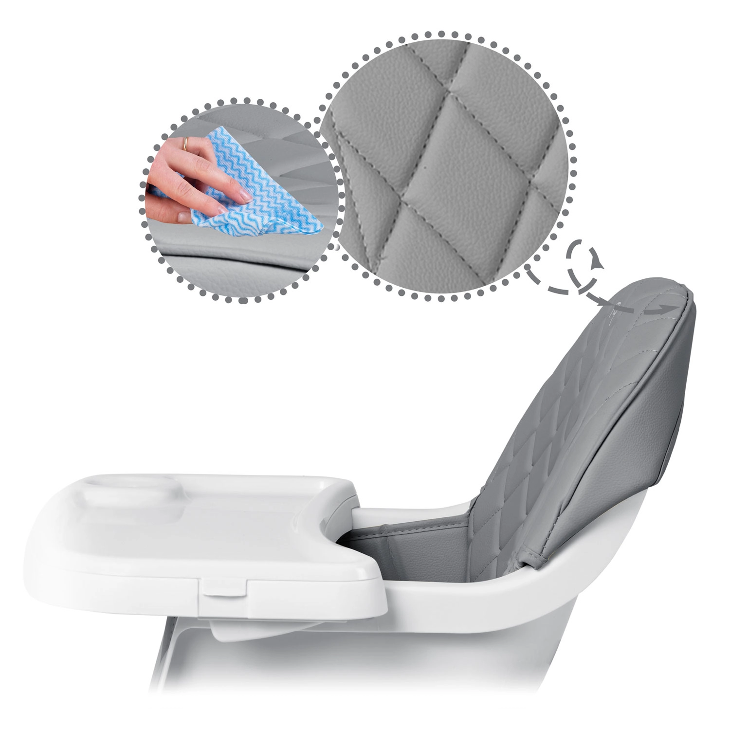 Tacka z podwyższonymi krawędziami i osobną górną wkładką skutecznie zatrzymuje bałagan. Po posiłku wystarczy ją zdjąć i opłukać lub włożyć do zmywarki. Tapicerkę z niechłonącą powierzchnią wystarczy przetrzeć ściereczką.