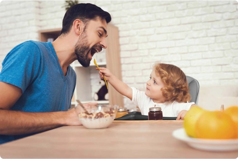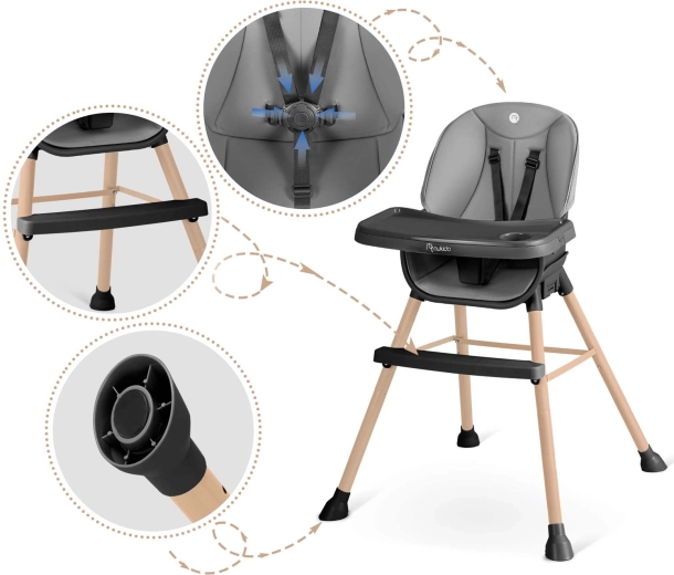 Stabilne nogi z antypoślizgowymi stopkami, solidna podpora na nogi oraz niezawodne 5‑punktowe pasy zapewniają dziecku bezpieczeństwo i wygodę podczas jedzenia i zabawy.