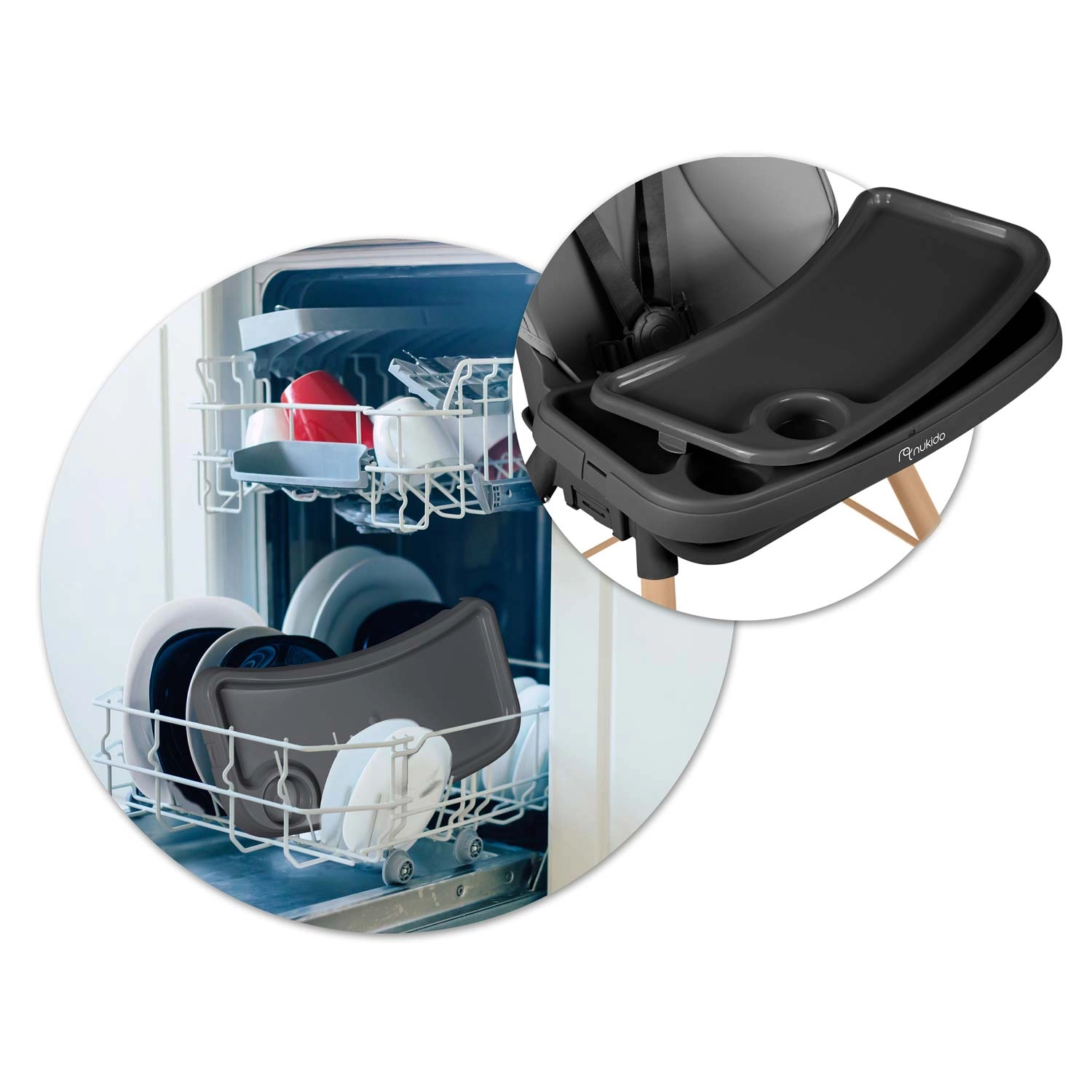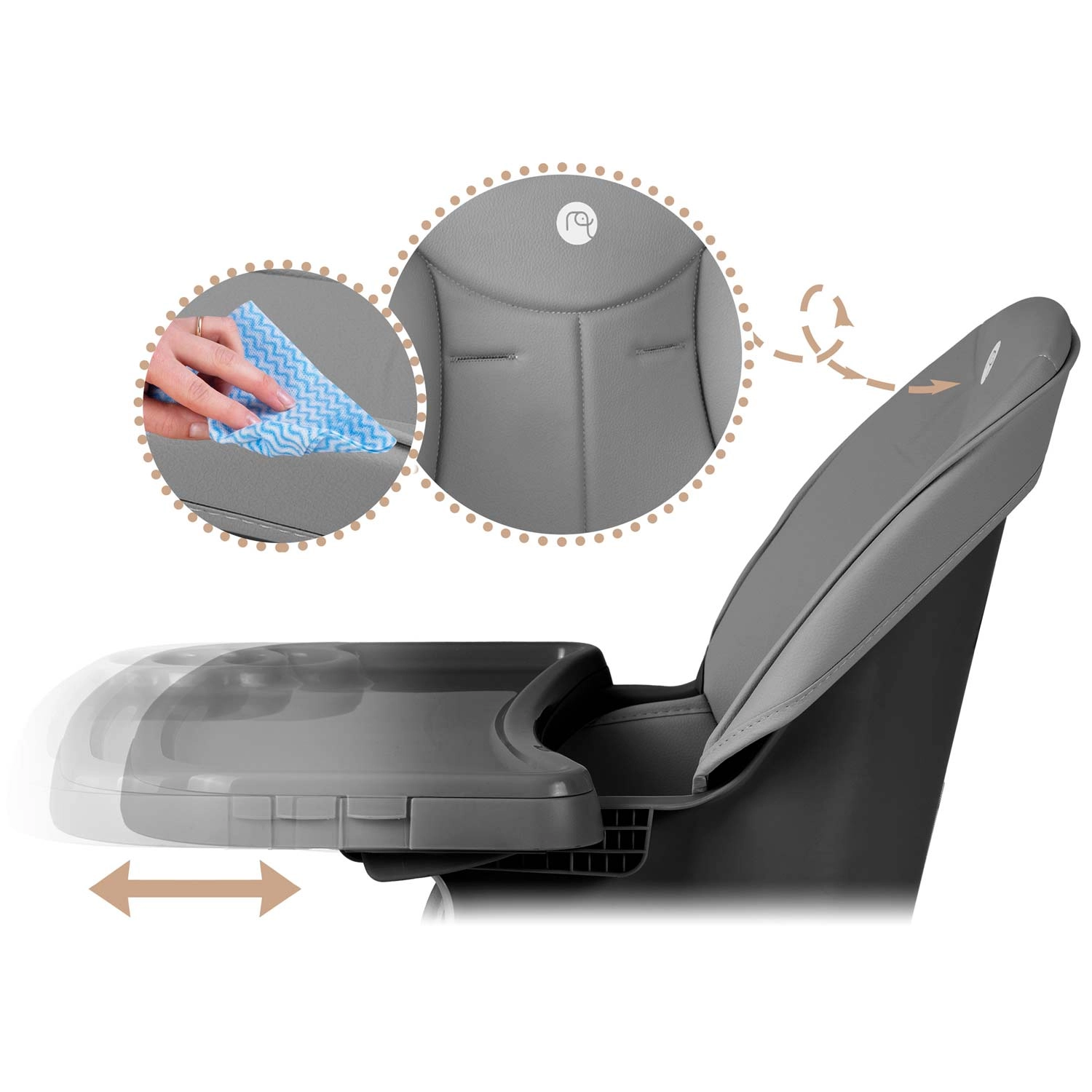 Główna tacka jest przesuwna i w pełni odpinana – z praktyczną wkładką i podwyższonymi krawędziami przeciw rozlaniom. Powierzchnie wystarczy przetrzeć wilgotną ściereczką, a tackę i wkładkę można myć w zmywarce. Dla maksymalnego bezpieczeństwa zastosowano 5‑punktowe pasy oraz solidną podpórkę pod nogi. Krzesełko spełnia rygorystyczną europejską normę EN 14988.