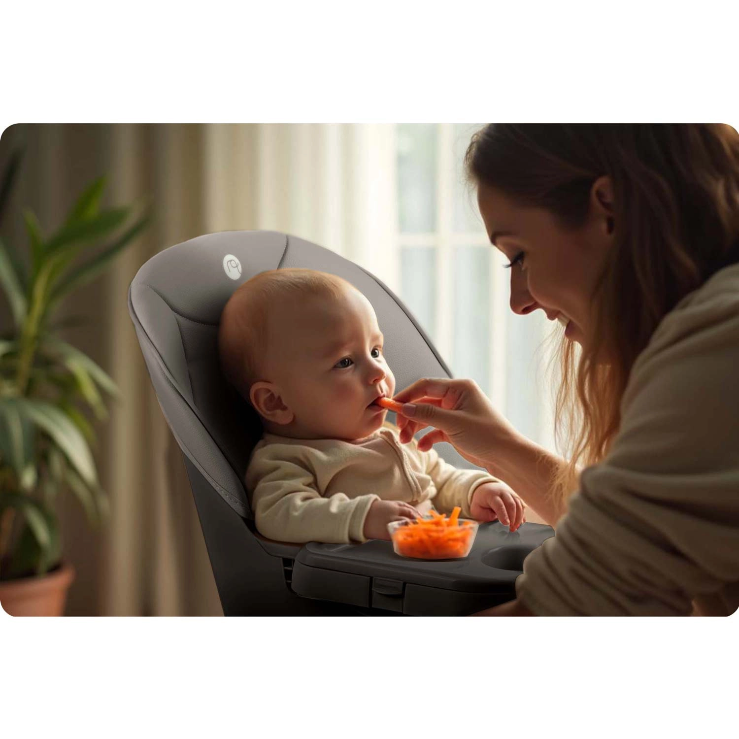 Przełączaj między wysokim krzesełkiem do karmienia, niskim fotelikiem z tacką oraz samodzielnym krzesełkiem do zabawy i czytania. Idealne od pierwszych posiłków po okres malucha.