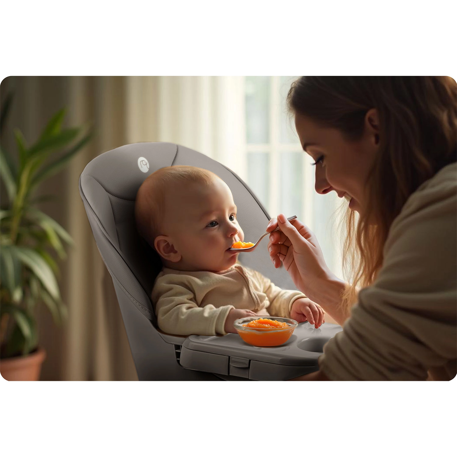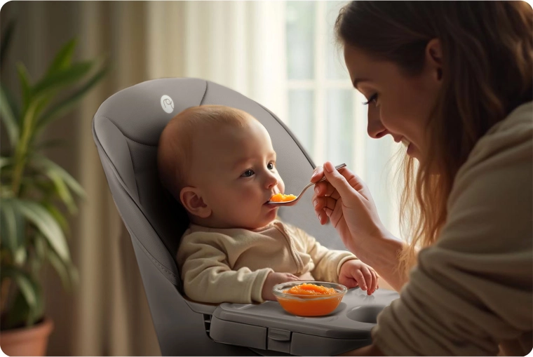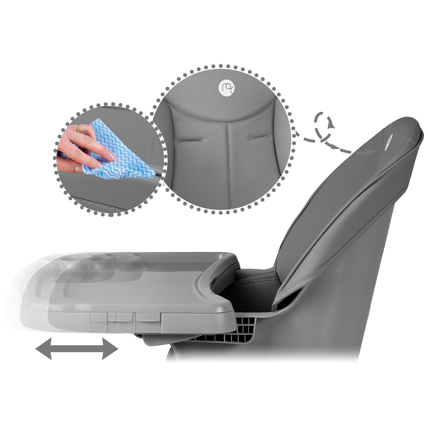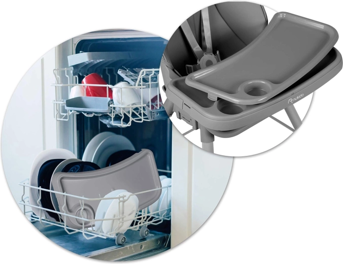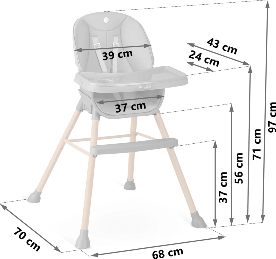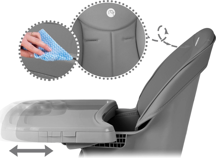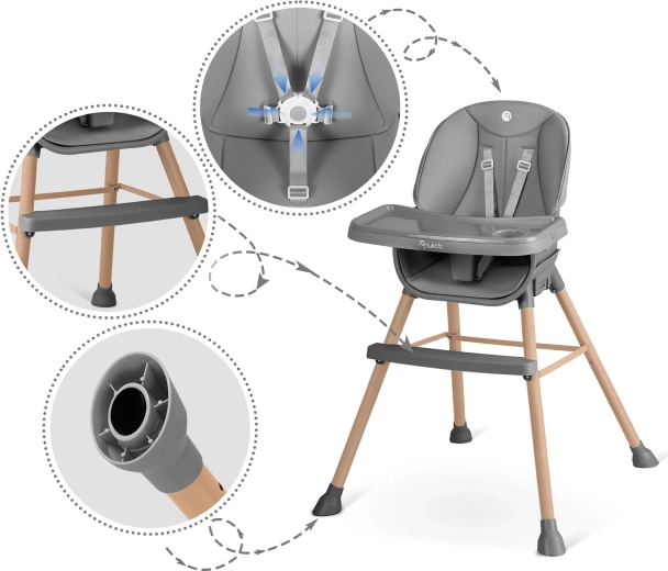 Dla maksymalnego bezpieczeństwa krzesełko wyposażono w 5‑punktowe pasy bezpieczeństwa, stabilną, szeroką podstawę z antypoślizgowymi końcówkami nóg oraz stabilną podpórkę pod nogi dla prawidłowej postawy ciała. Blat można przybliżać/oddalać, a w razie potrzeby całkowicie zdjąć, aby dziecko mogło siedzieć bezpośrednio przy stole.